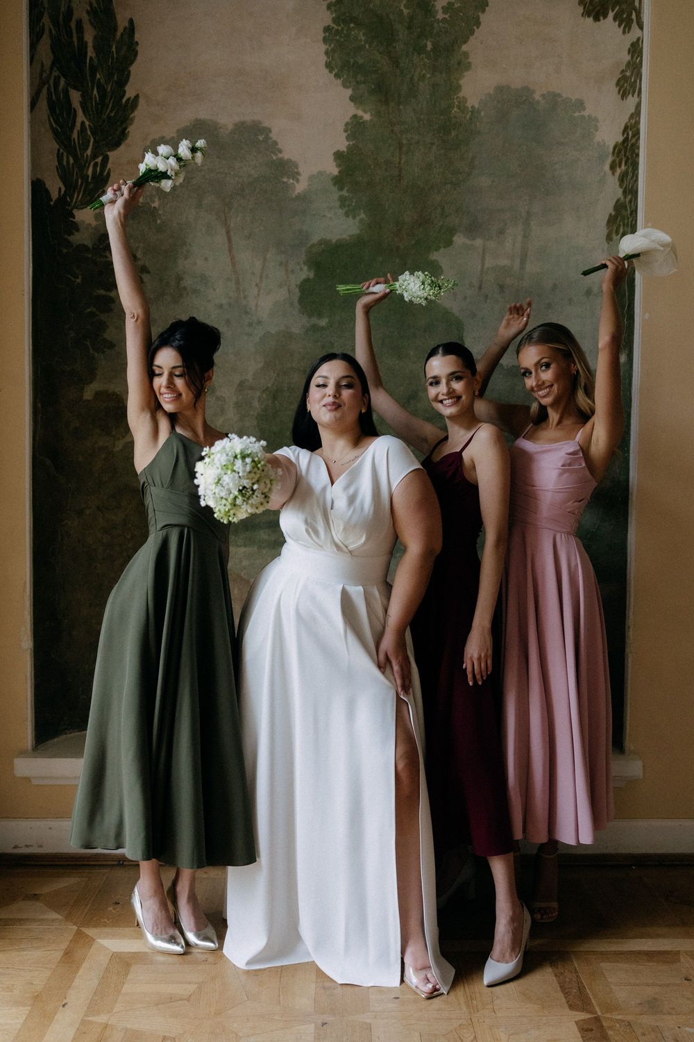Dla odważnych i radosnych stylizacji polecamy klasyczną tęczę — każda druhna w innym kolorze. To świetny sposób, by nadać uroczystości energii i wyjątkowości. Alternatywnie możecie wybrać tą sukienkę multiway w jednym kolorze, którą każda druhna zawiąże na swój sposób. To rozwiązanie, które łączy spójność z indywidualnym stylem – jedna barwa, wiele fasonów.