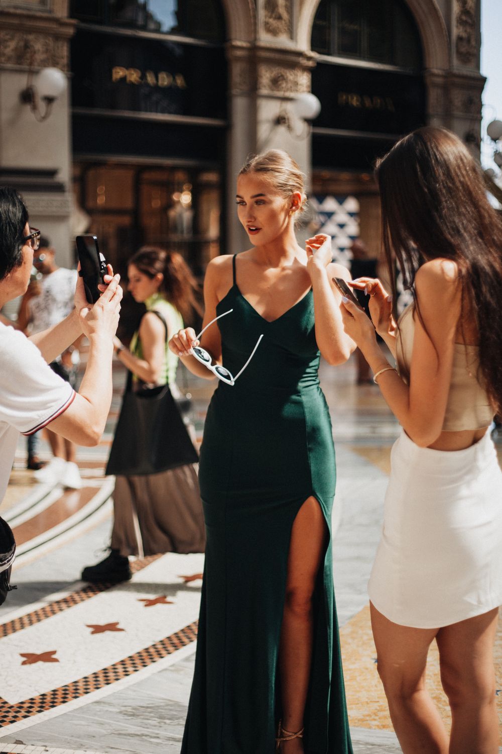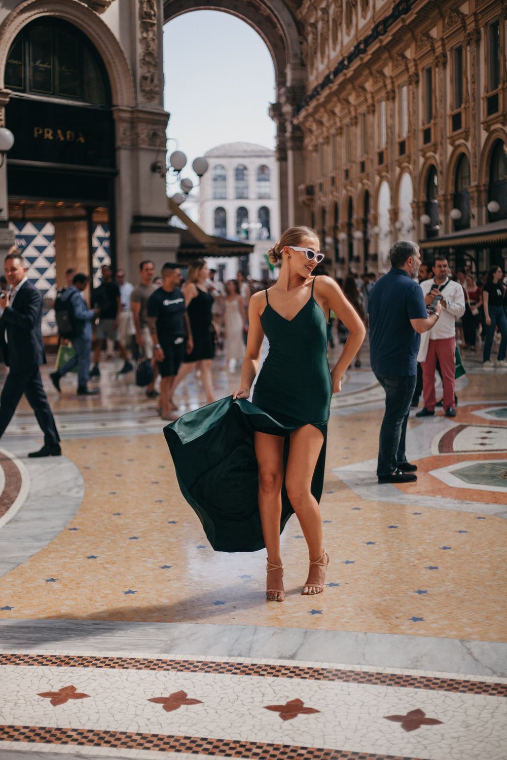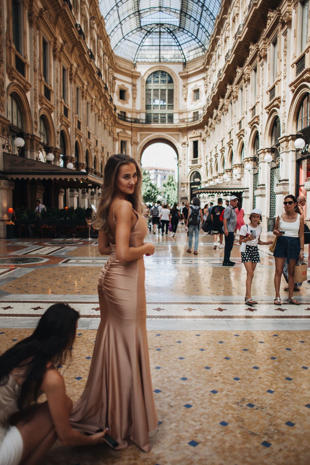 Na sam koniec zostawiliśmy światową stolicę mody- Mediolan. Nasze długie suknie wieczorowe idealnie wpisały się w klimat galerii. Największą furorę wzbudził prosty i elegancki model Milano z trenem. Turyści i fotoreporterzy na bieżąco podchodzili i pytali o sfotografowanie naszej modelki i cudownych kreacji w akcji. Wielu z nich nagrywało filmiki oraz transmisje na żywo. Można powiedzieć, że sukienki Kulunove dosłownie poszły w świat.