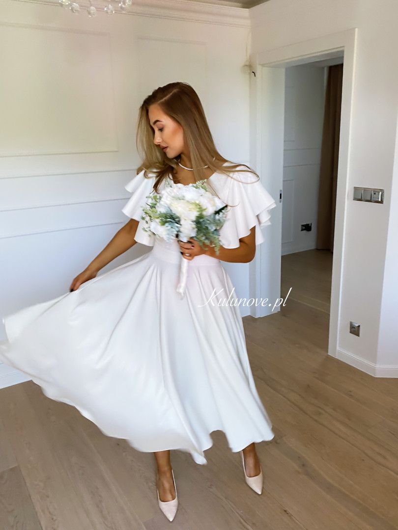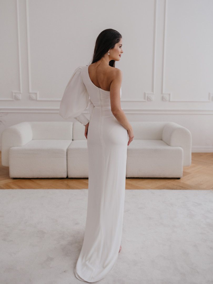 Zanim wybierzesz konkretną kreację, warto się dowiedzieć, jak dopasować suknię ślubną do figury, jeśli masz pokaźnych rozmiarów biust. Dla niskiej osoby z dużym biustem dobrym wyborem będzie sukienka z dekoltem w serek, który optycznie wydłuży szyję i nada sylwetce proporcji. Stylizacje o kroju princeski, czyli lekko rozszerzające się ku dołowi, również będą dobrym rozwiązaniem, ponieważ subtelnie ukryją niedoskonałości w dolnej części ciała i zwrócą uwagę na piersi. Warto również unikać sukienek z mocno wyciętymi dekoltami, ponieważ mogą przytłoczyć i zdominować całą sylwetkę. Ważne jest, aby sukienka była dobrze dopasowana do figury, nie za ciasna, ale również nie za luźna, aby mogła podkreślać atuty. Dodatkowo warto zwrócić uwagę na fakturę i wzory materiału. Sukienki z ciężkich i masywnych tkanin, takich jak np. brokat, mogą dodatkowo powiększać biust i zdominować sylwetkę, dlatego warto wybrać lekkie, przewiewne tkaniny, które będą subtelnie opadać. Wzory również mogą wpłynąć na optyczne zwiększenie lub zmniejszenie biustu, więc warto wybrać te bardziej stonowane i delikatne. Możesz zdecydować się na minimalistyczną suknię wieczorową w białym kolorze, to coraz częstszy wybór zwłaszcza wśród fanek delikatnych i eleganckich stylizacji.