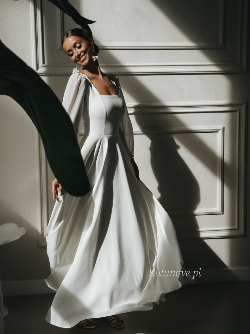 Prosta suknia ślubna z kwadratowym dekoltem.