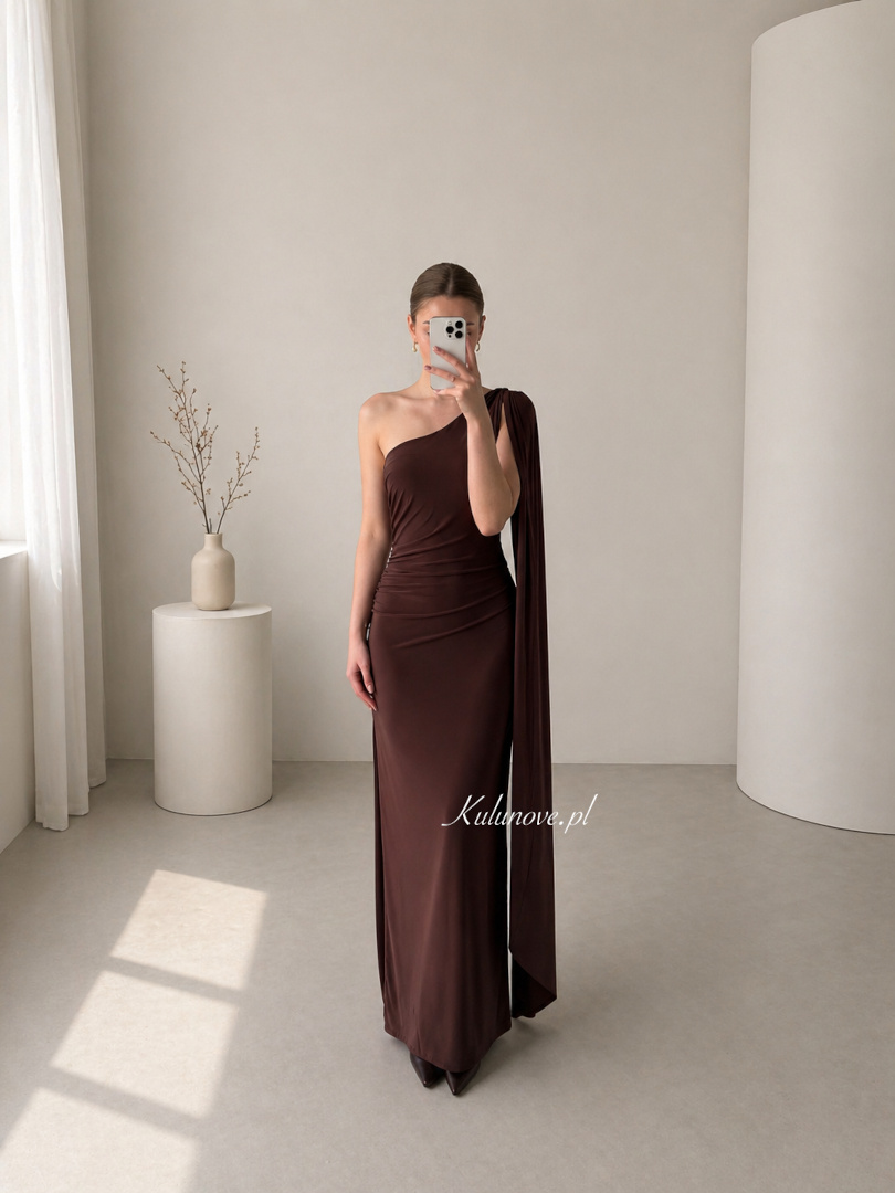 Sukienka w głębokim, czekoladowym odcieniu została uszyta z elastycznego, przyjemnego w dotyku materiału, który subtelnie dopasowuje się do sylwetki, podkreślając jej atuty.