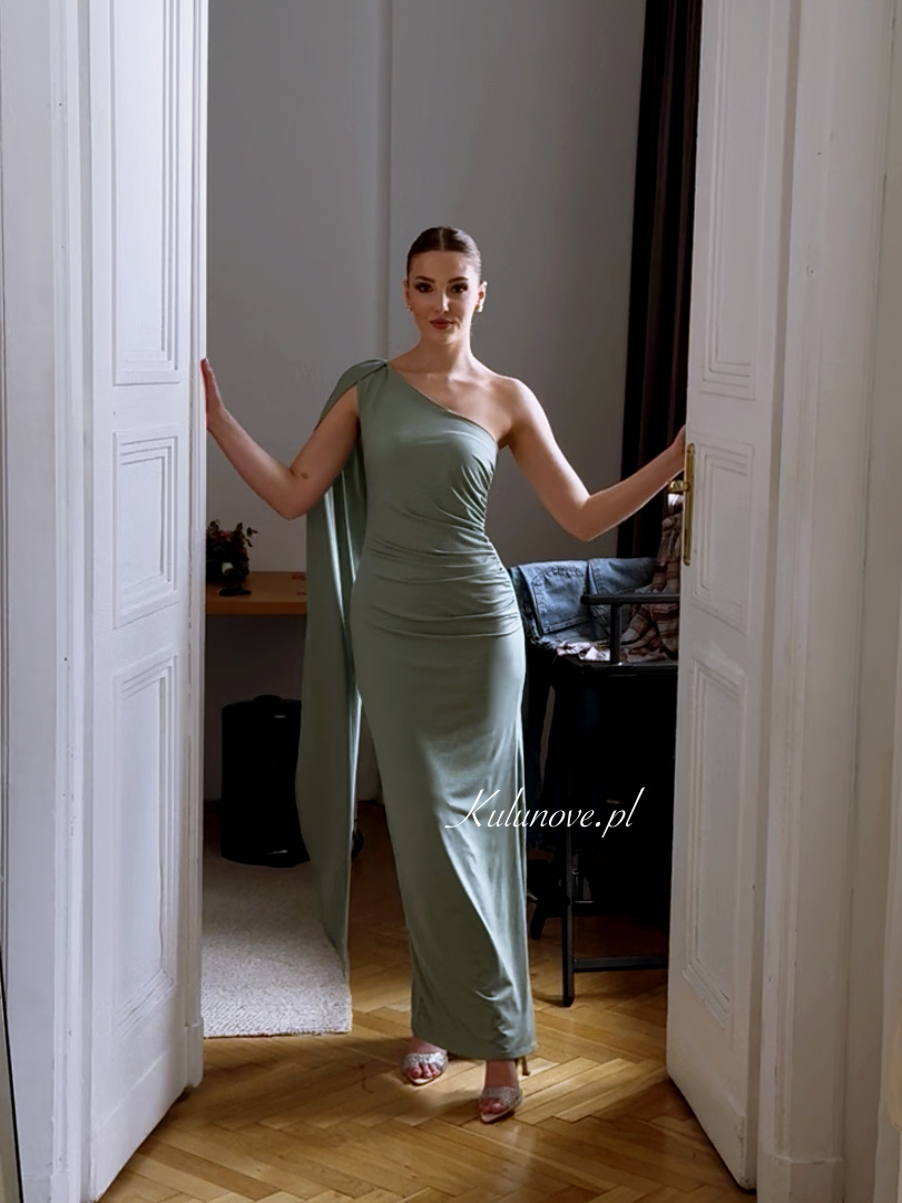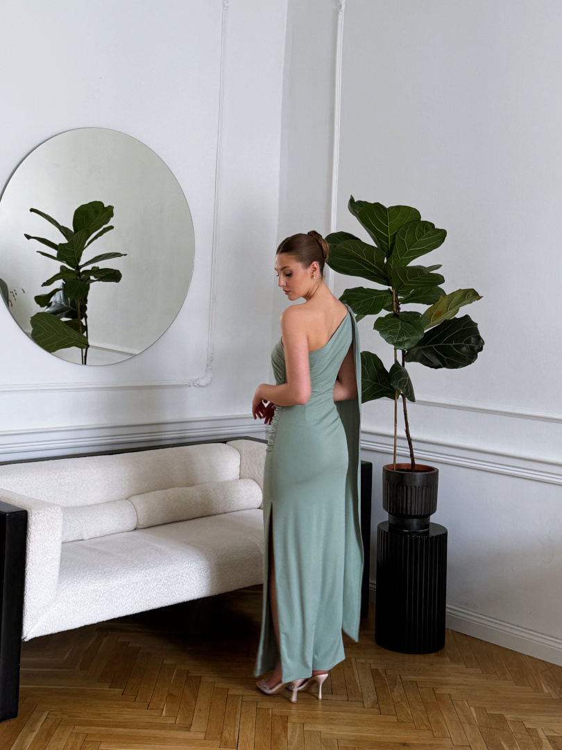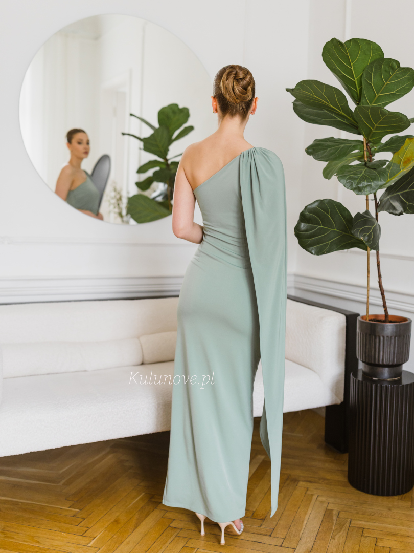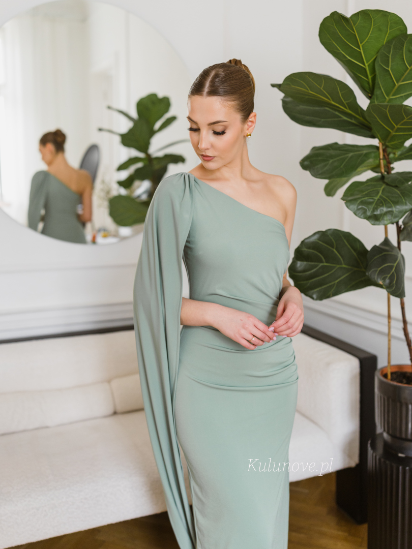 Model wyróżnia się asymetrycznym dekoltem oraz jednym, długim, swobodnie opadającym rękawem, który nadaje stylizacji lekkości i wyjątkowego charakteru.