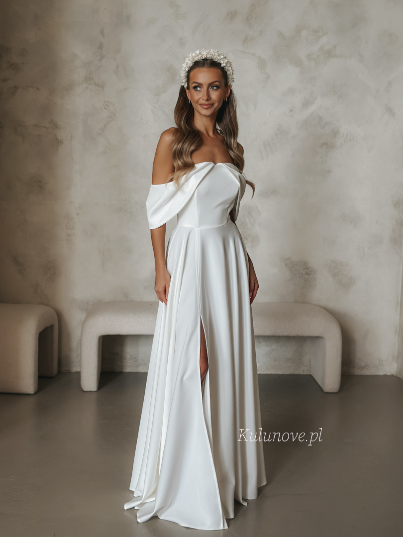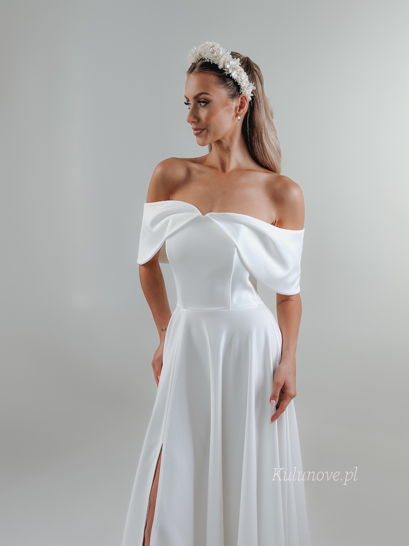 Abby - długa suknia ślubna ecru z dekoltem w stylu hiszpańskim z rozcięciem na nogę.