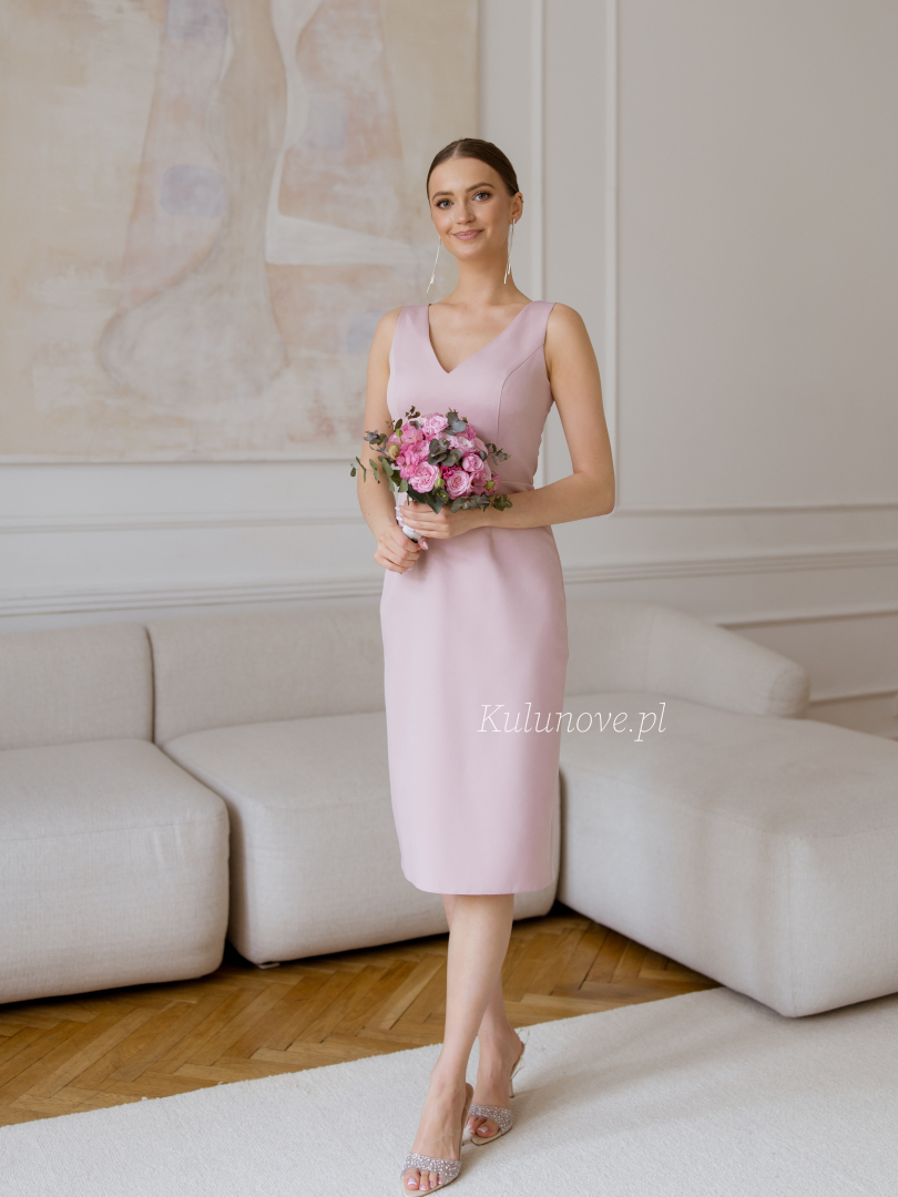 Górna część sukienki jest gładka i minimalistyczna, idealnie przylega do ciała, akcentując talię, natomiast lekko zwężany dół o długości midi nadaje jej szyku i wyrafinowania.