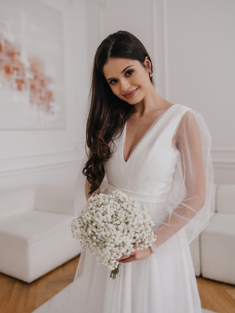 Prosimy o zachowanie szczególnej ostrożności przy zapinaniu sukienki. Sugerujemy, aby przed zapięciem upewnić się, że tiul jest równo ułożony i nie znajduje się zbyt blisko zamka. Dbałość o ten szczegół pomoże uniknąć przypadkowych zniszczeń oraz przedłuży trwałość produktu.