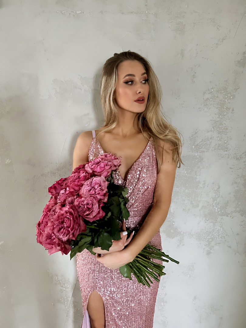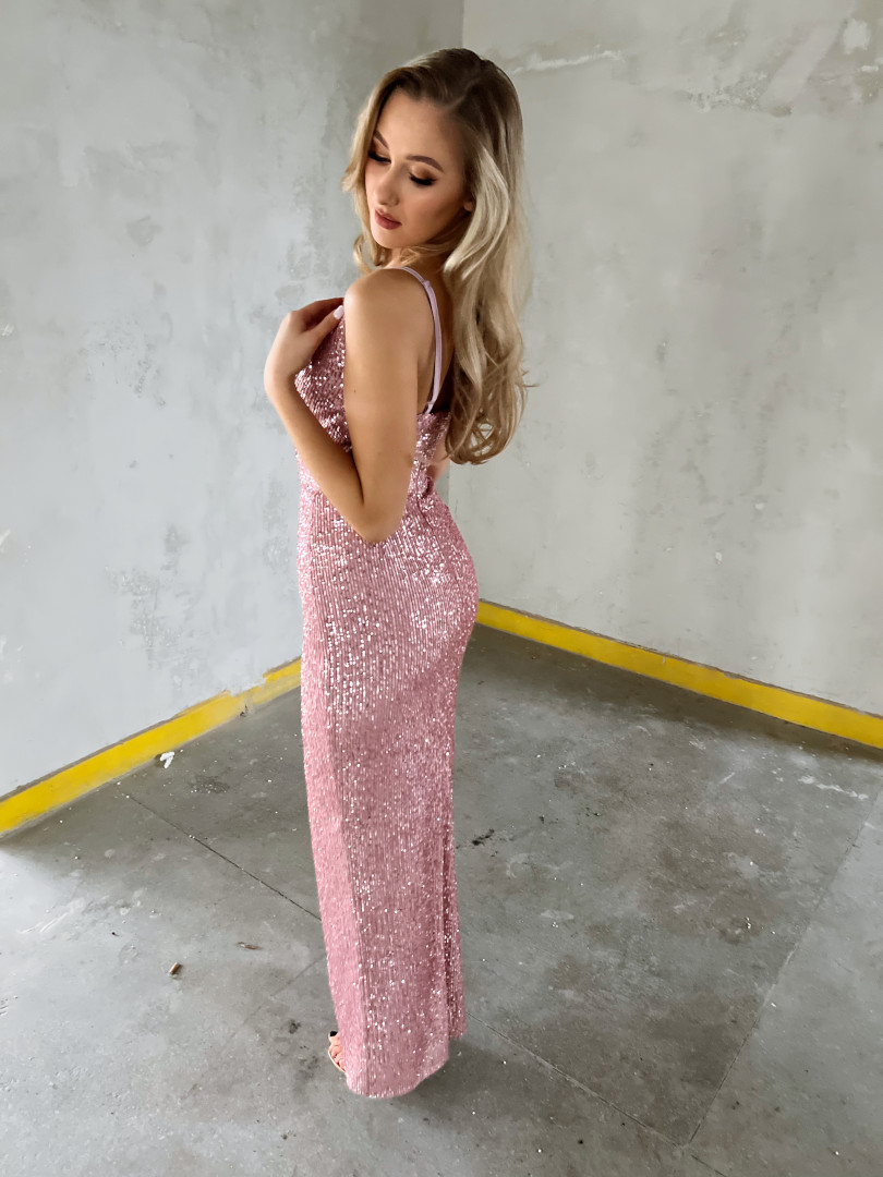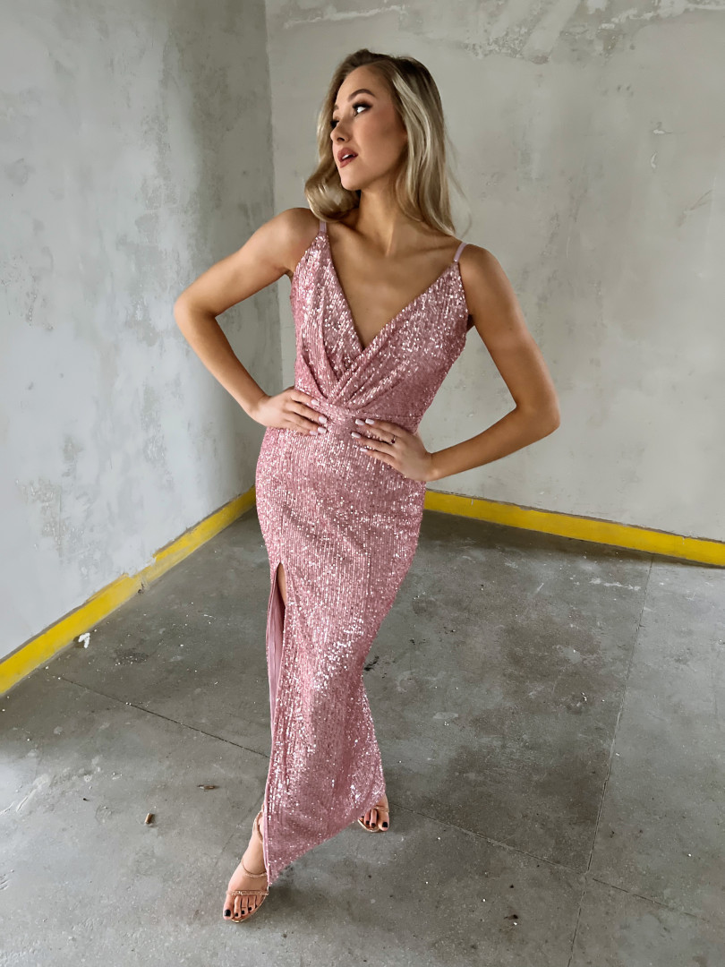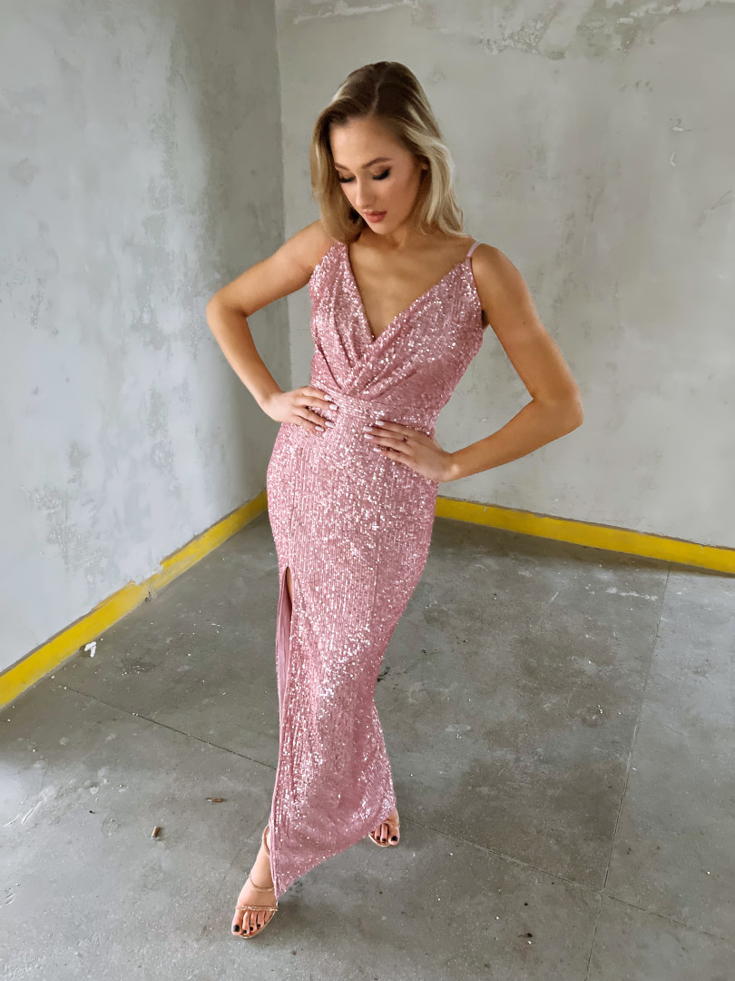 Andrea - cekinowa sukienka z kopertowym dekoltem z kolorze różowym