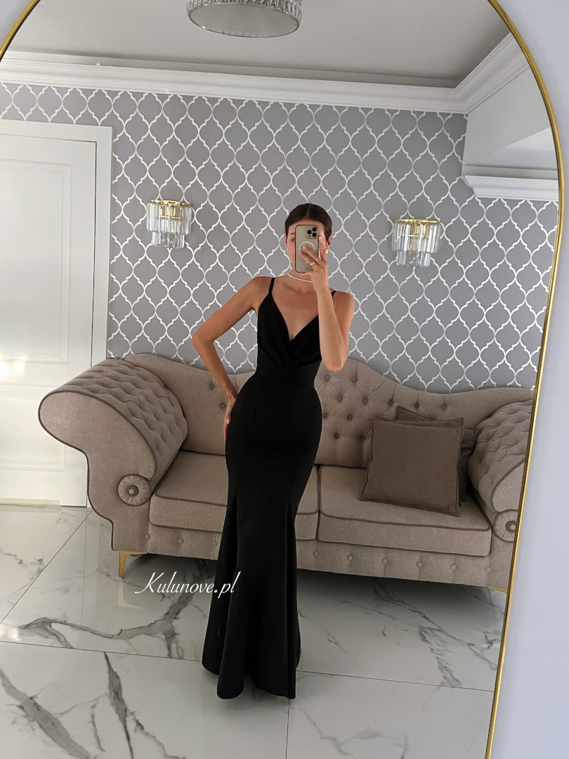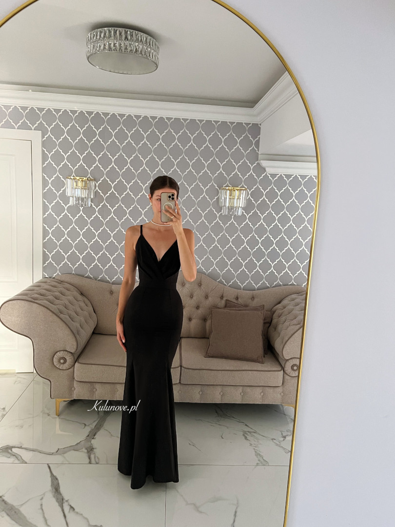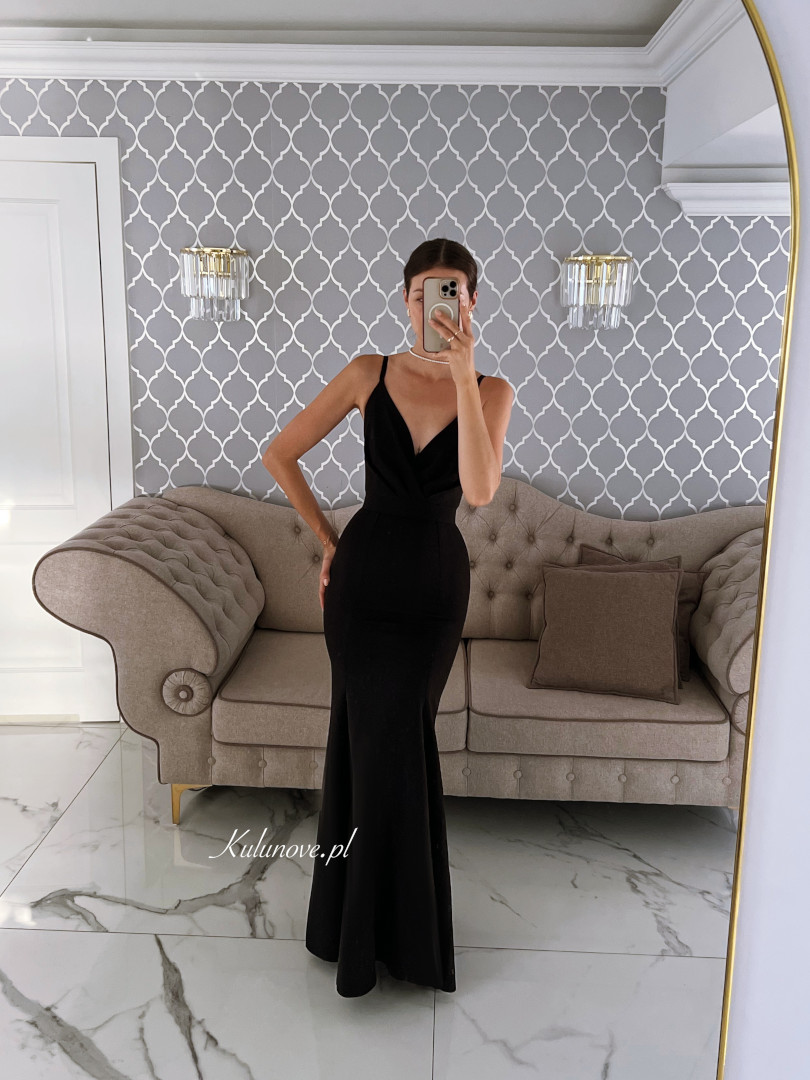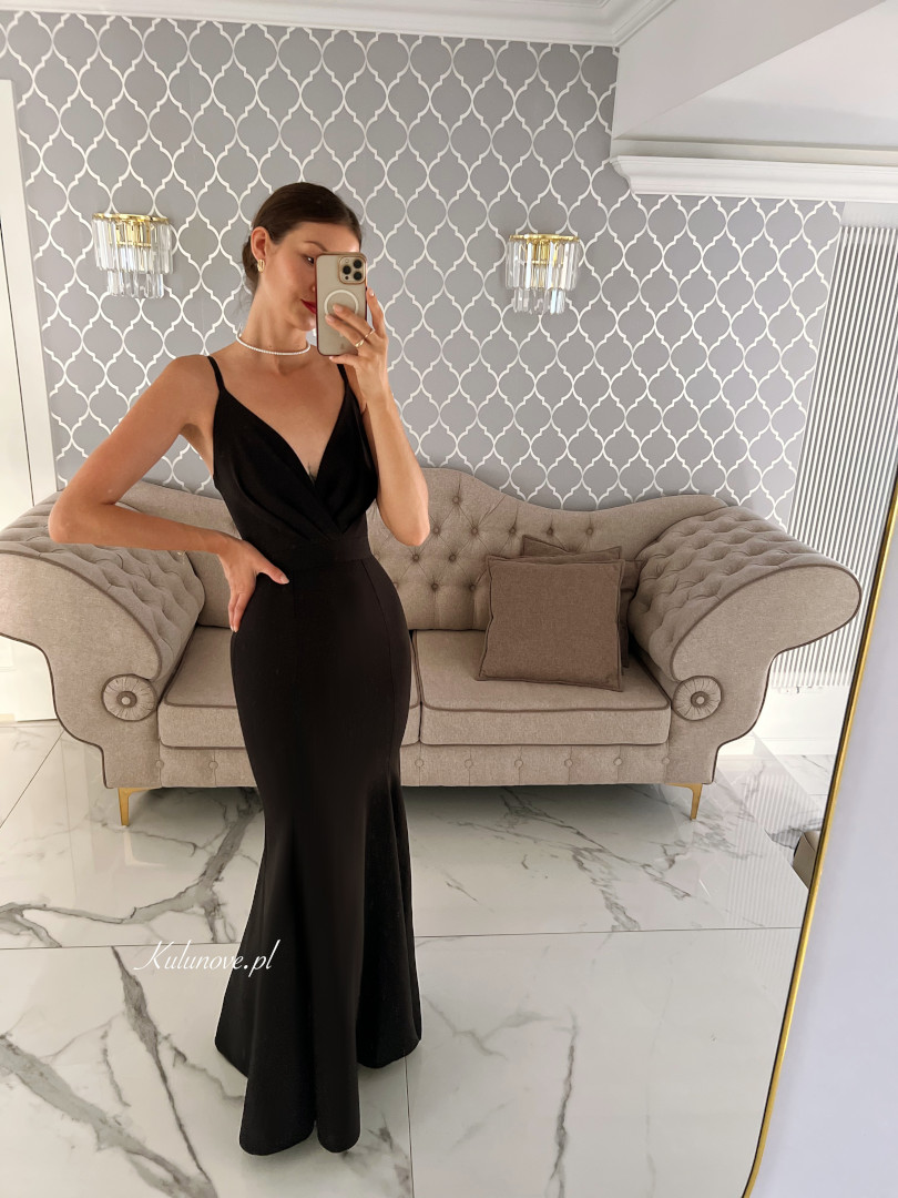 Tył sukienki pięknie eksponuje plecy dzięki głębokiemu dekolcie, który zwęża się ku dołowi.