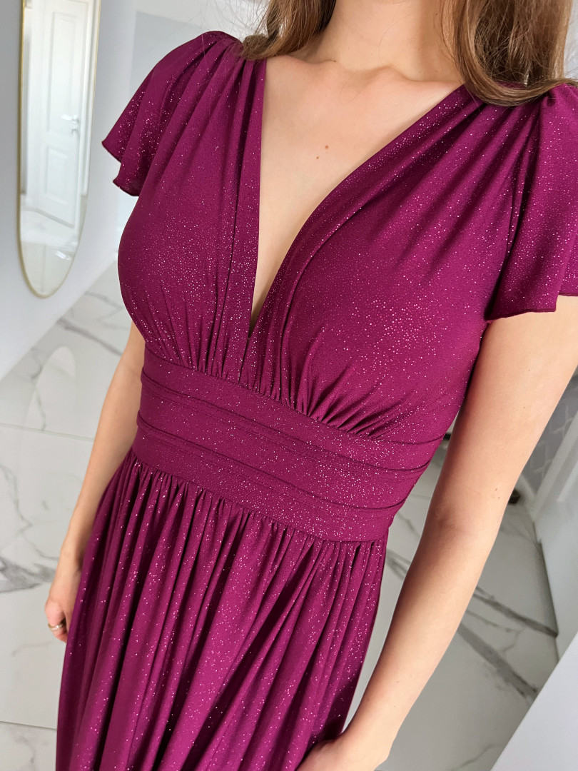 Sylwetka staje się optycznie wyszczuplona dzięki marszczeniom i odcięciu w talii.