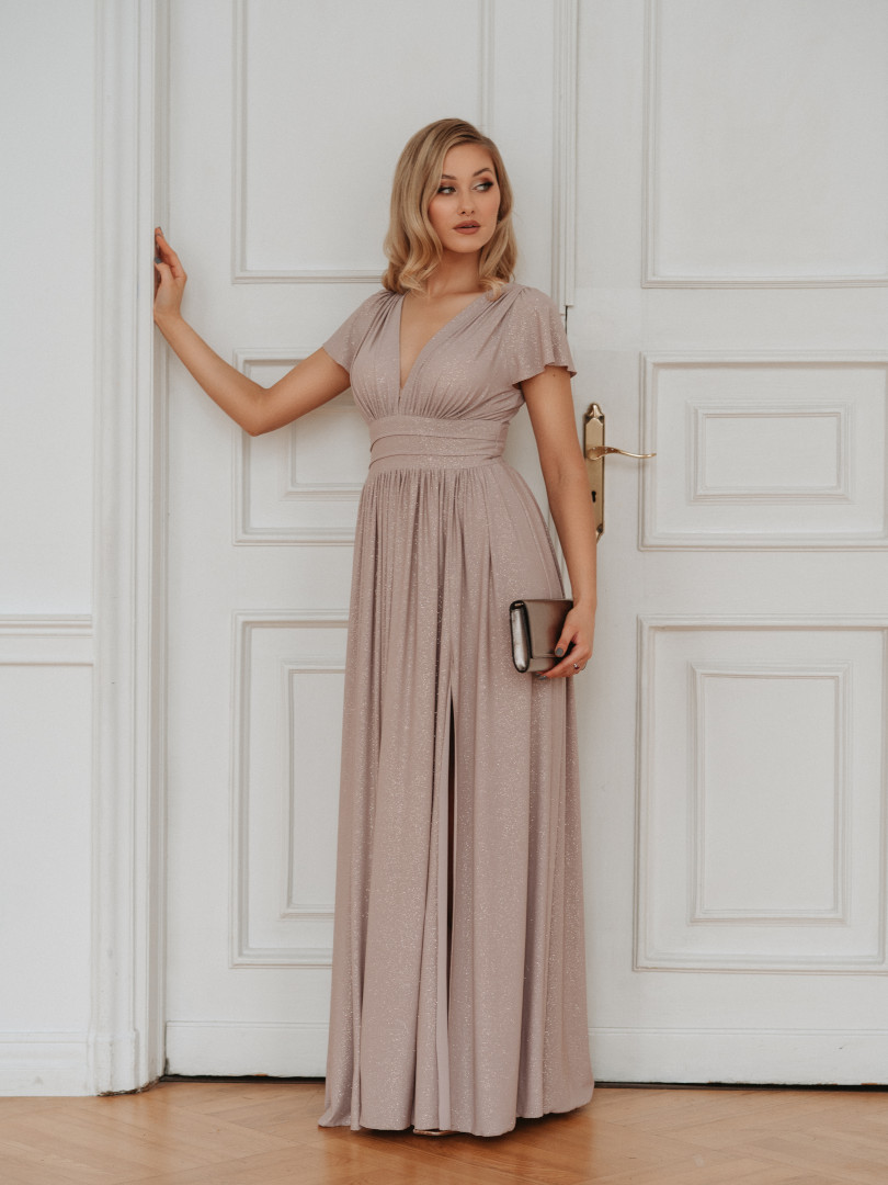 Suknia pięknie się błyszczy podczas ruchu, ponieważ pokryta jest brokatem.