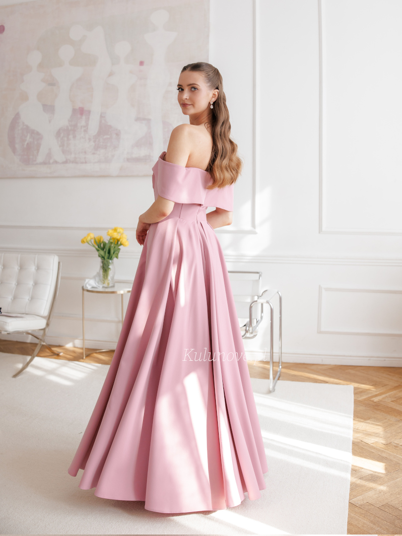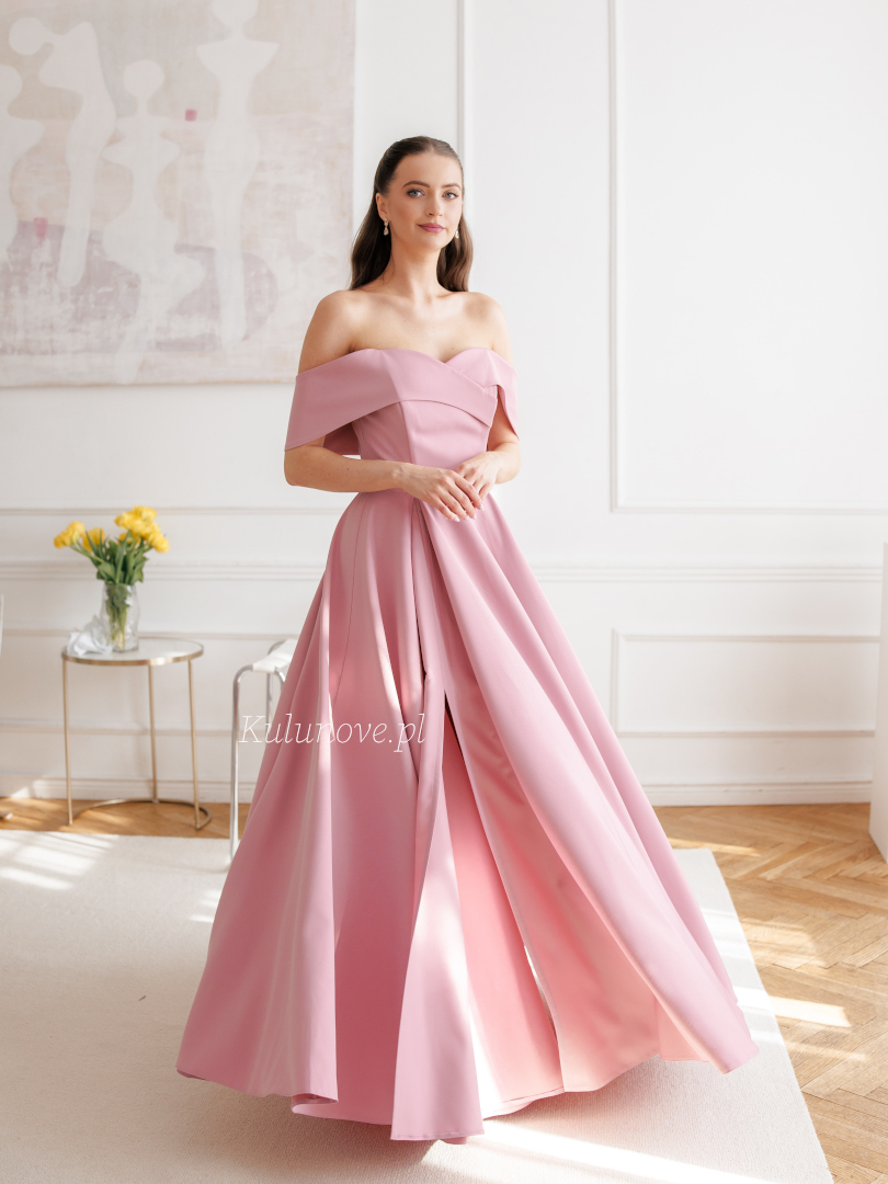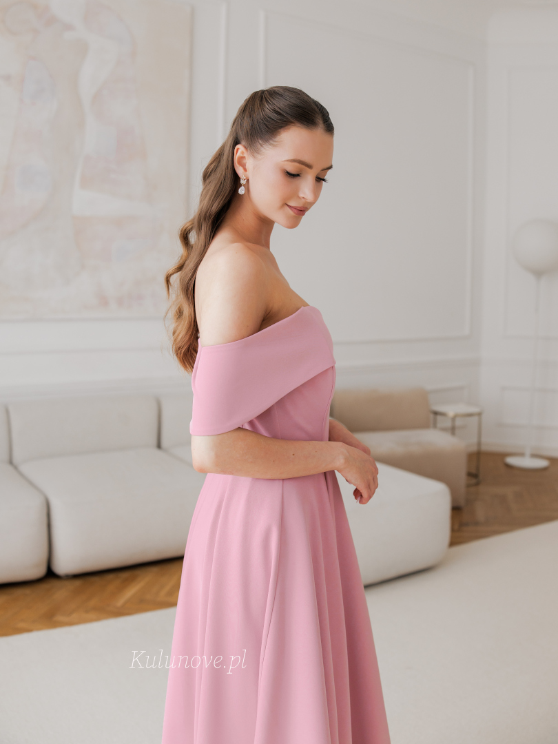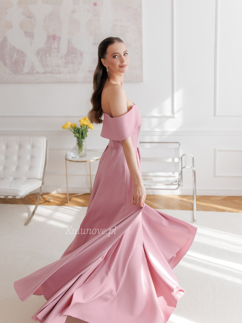 Angelina maxi - rozkloszowana delikatna sukienka w kolorze brudnego różu odkrywająca ramiona z opadającymi rękawkami i gładką tkaniną
