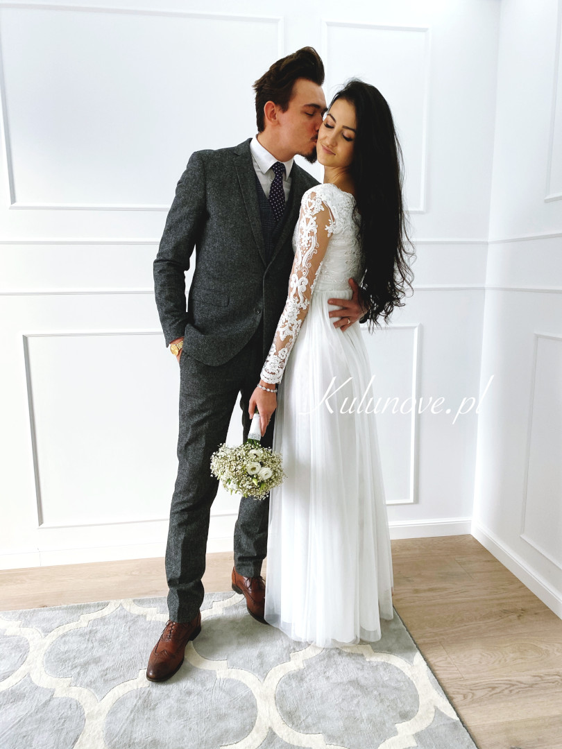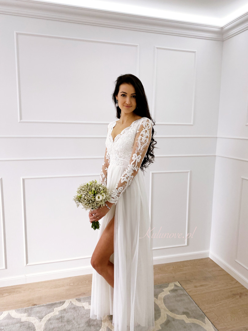 Zjawiskowa suknia z pięknymi, koronkowymi rękawami, która w idealny sposób podkreśla talię.