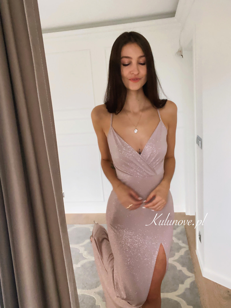 Naturalnym zjawiskiem jest osypujący się brokat, którego z czasem będzie mniej na sukience. Nie należy pocierać tkaniny. Prać delikatnie według zaleceń na metce.