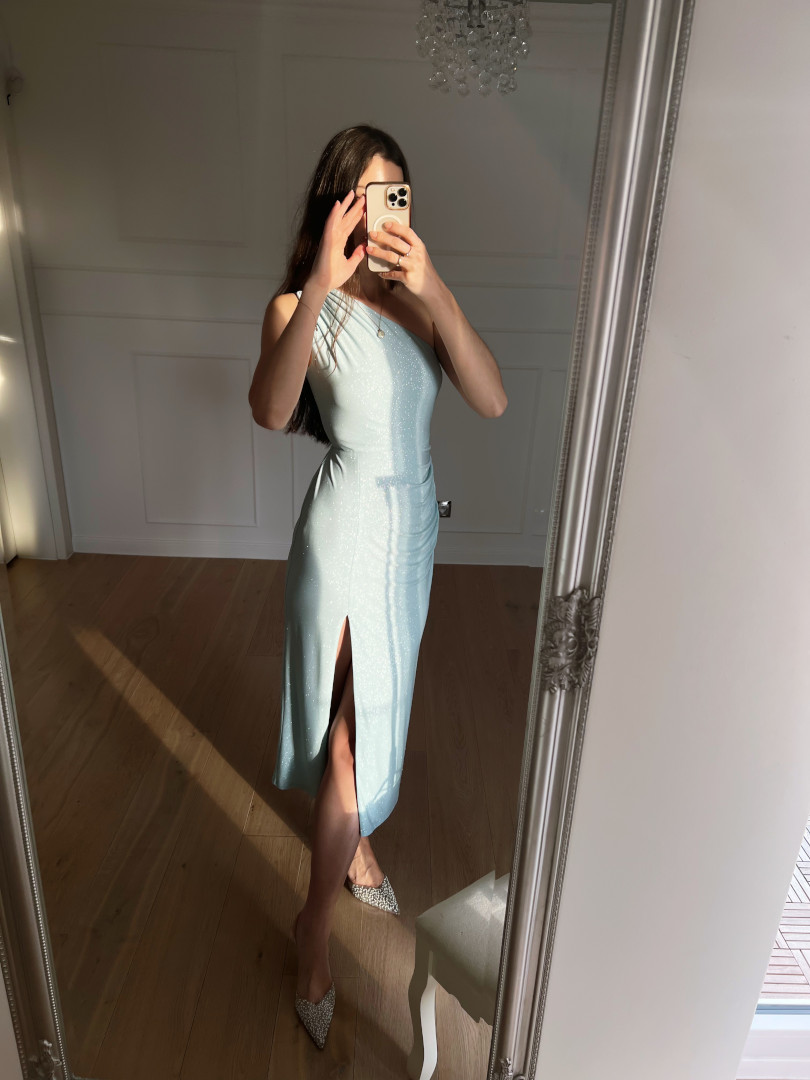 Ariela - miętowa dzianinowa brokatowa sukienka na jedno ramię za kolano