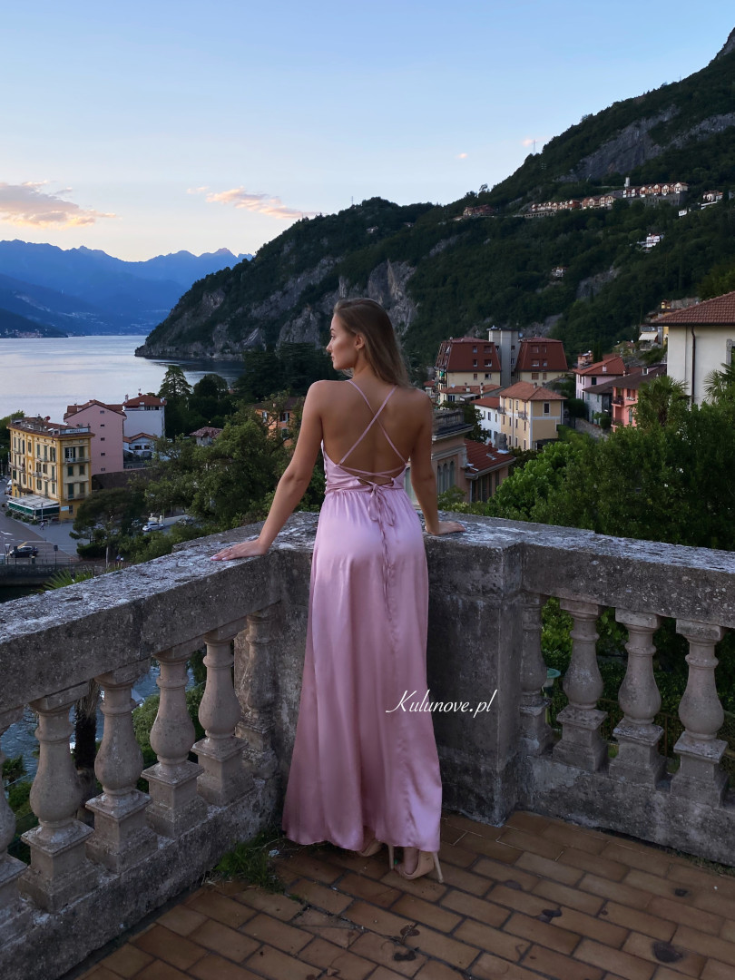 Elegancka satynowa sukienka z wiązaniem na plecach.