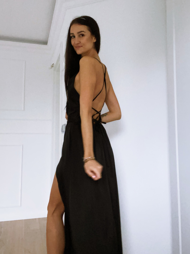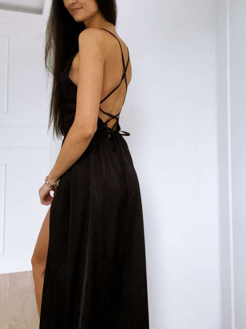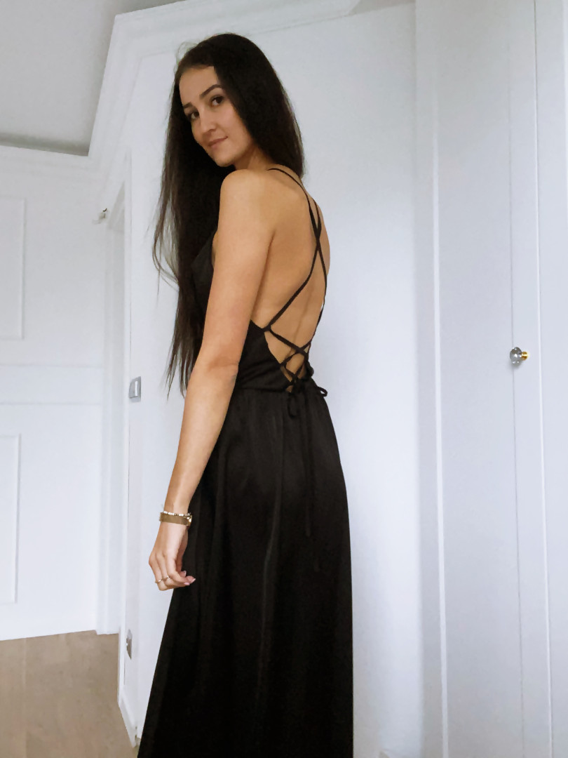 Elegancka satynowa sukienka z wiązaniem na plecach.