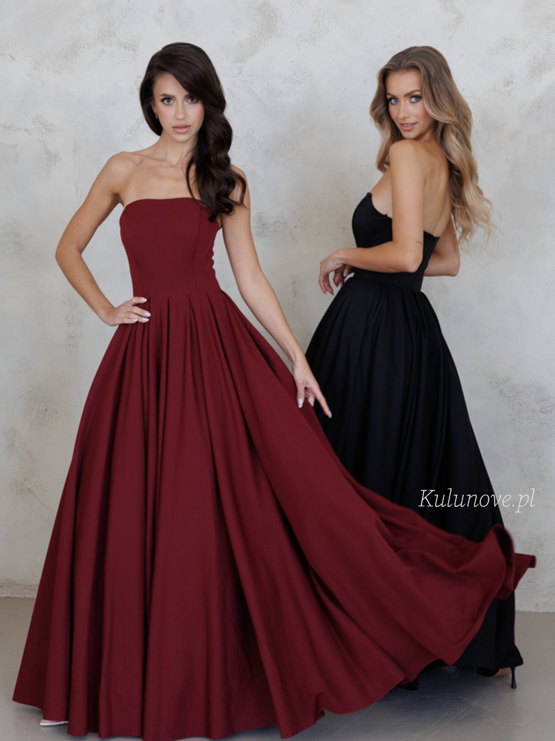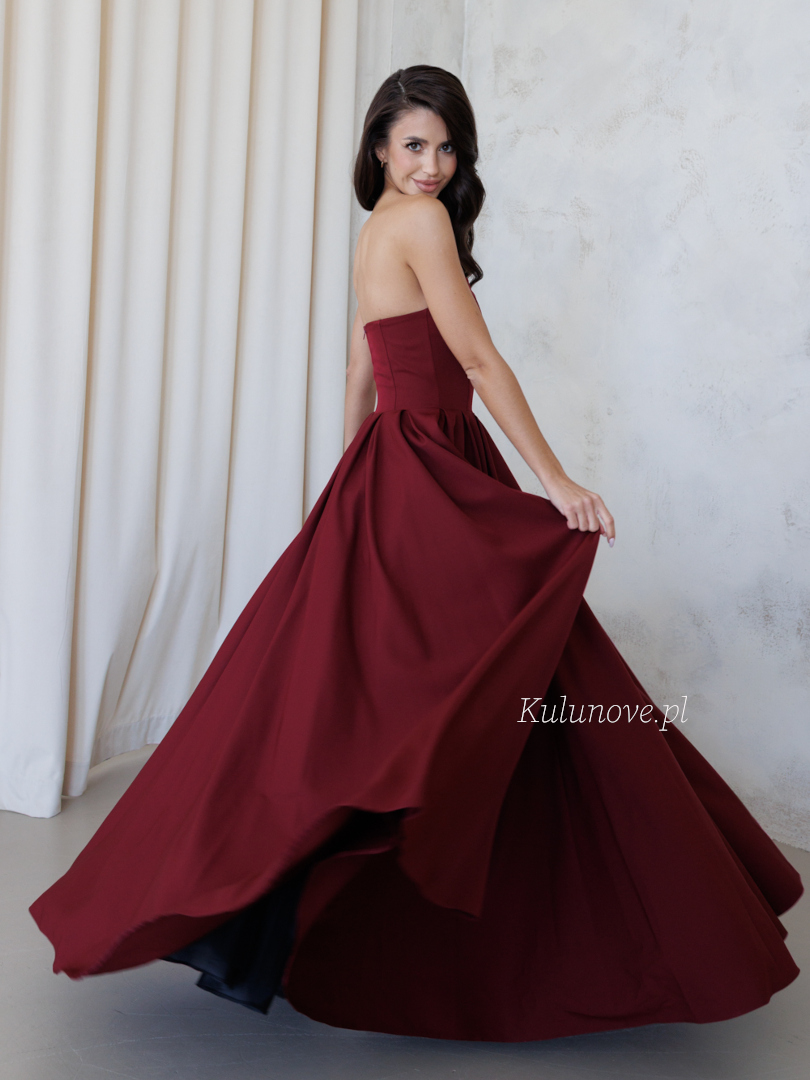 Brak ramiączek subtelnie eksponuje ramiona i dekolt, a głęboki, bordowy kolor dodaje kreacji wyjątkowego charakteru i luksusowego blasku.
