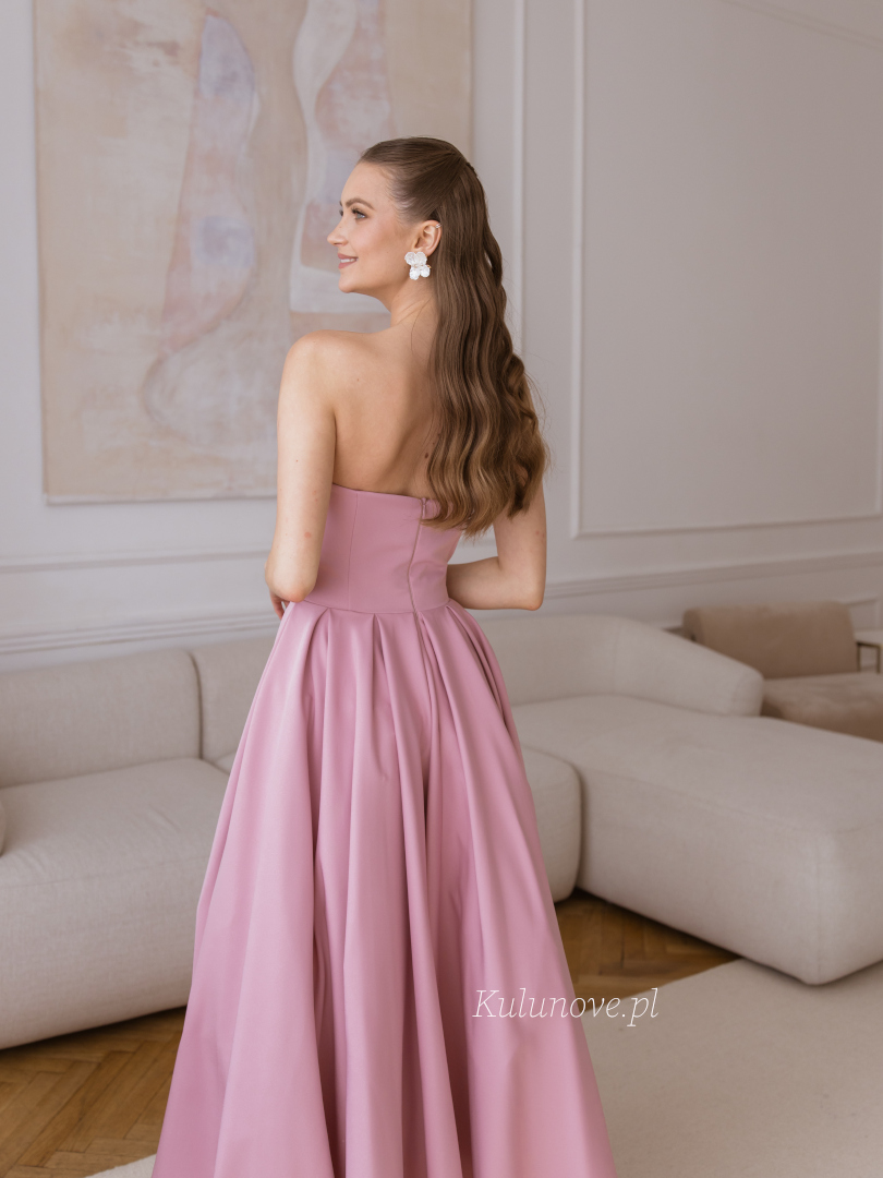 Delikatny, pudrowy odcień brudnego różu podkreśla romantyczny i subtelny charakter sukienki.