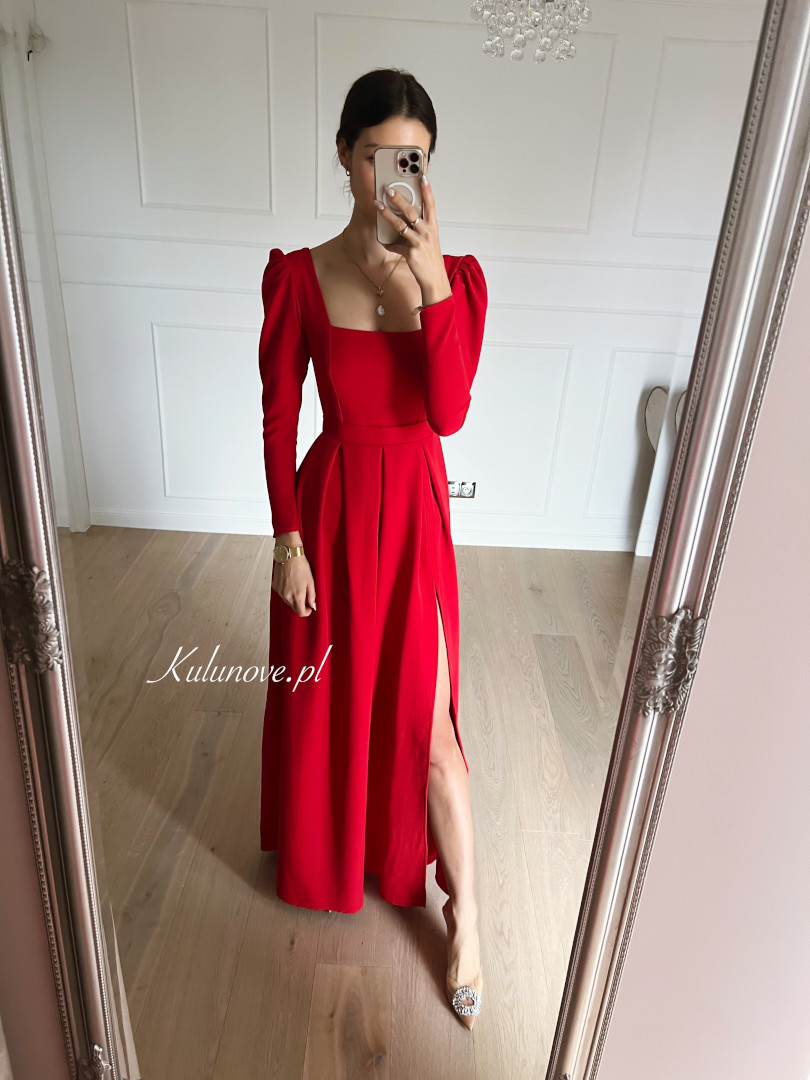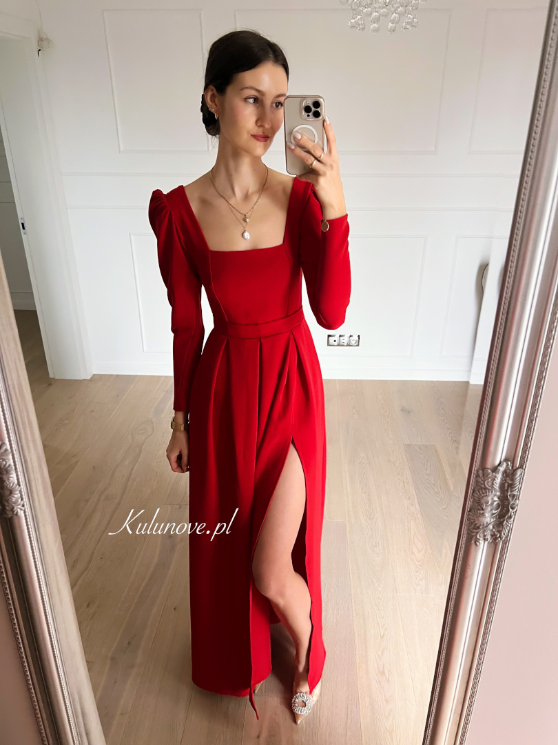 Sukienka ma rozporek na prawą nogę. Ramiona ozdobione są bufkami.