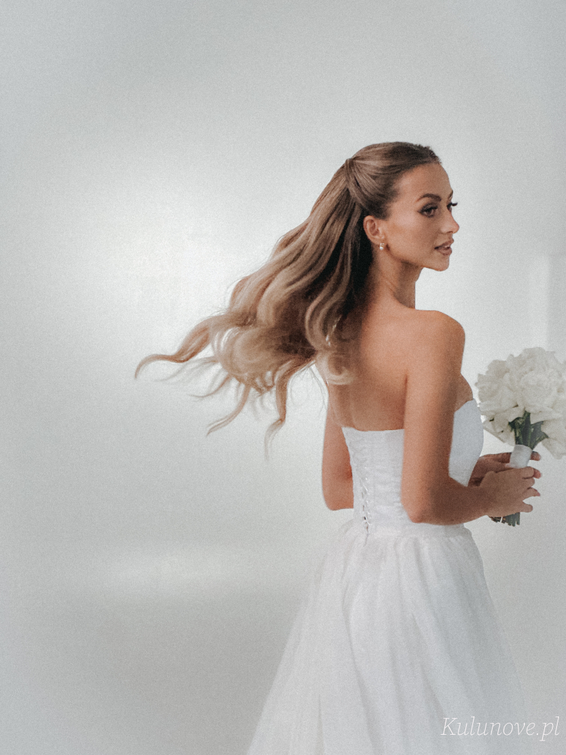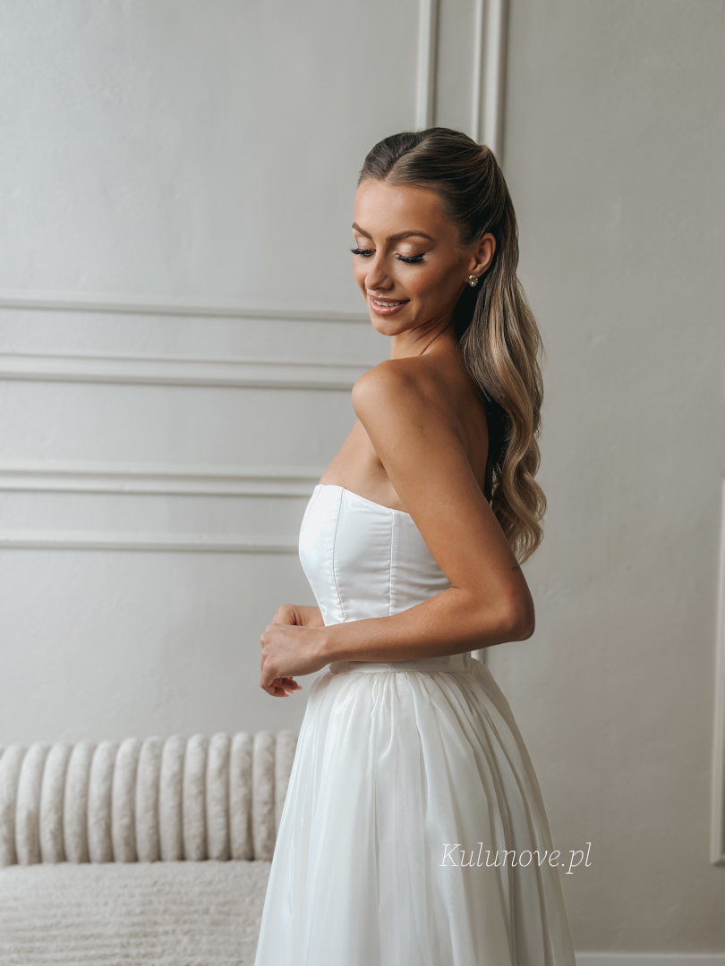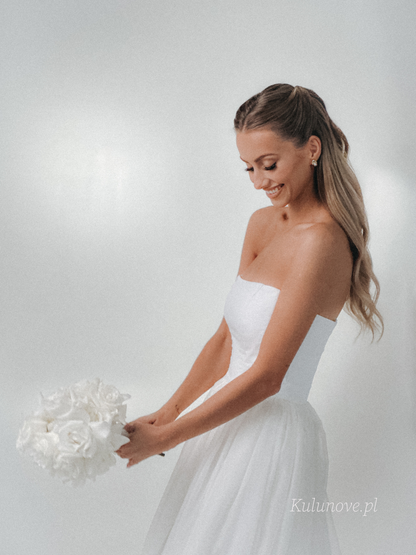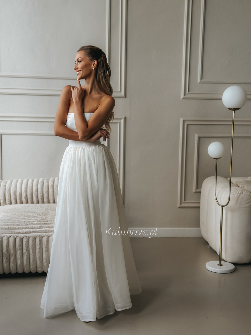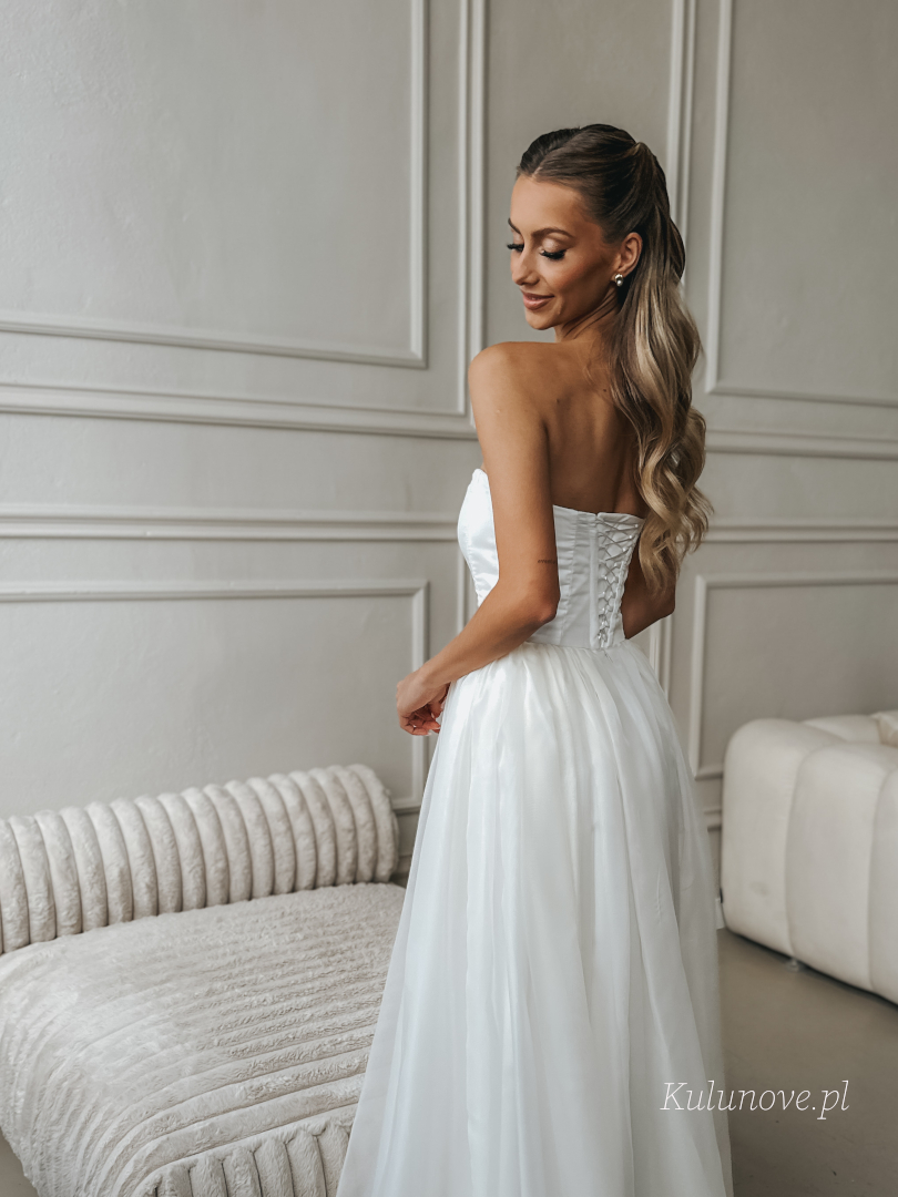 Górna część sukni jest bez ramiączek, ma gładki, dopasowany krój, który subtelnie modeluje sylwetkę.