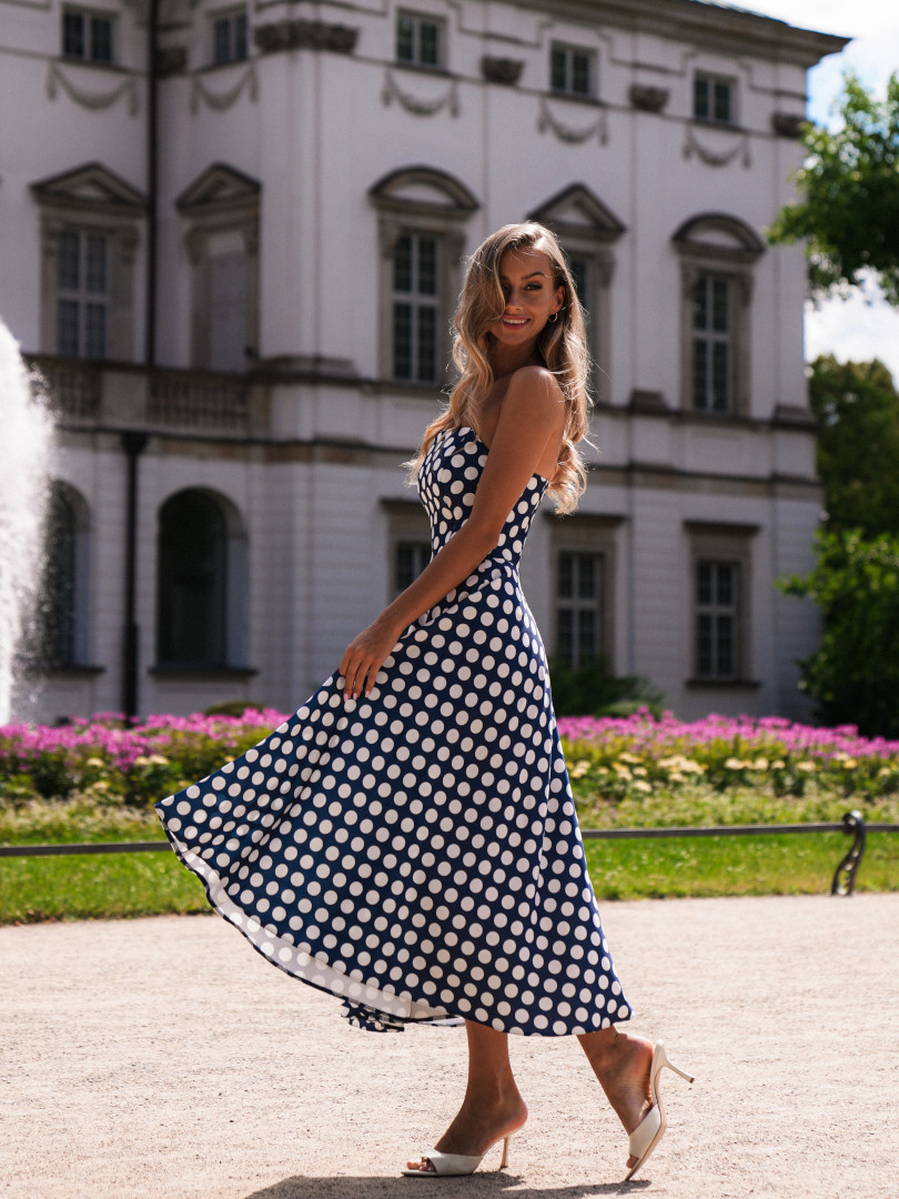 Bridget - gorsetowa sukienka midi granatowa w kropki z rozkloszowanym dołem