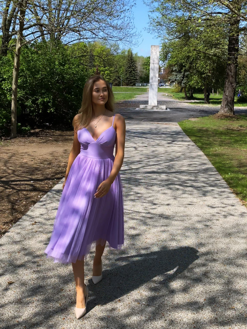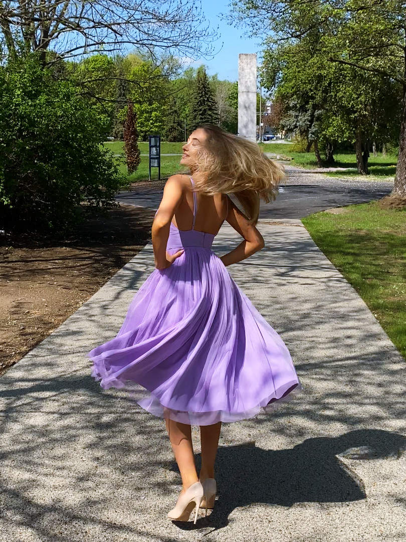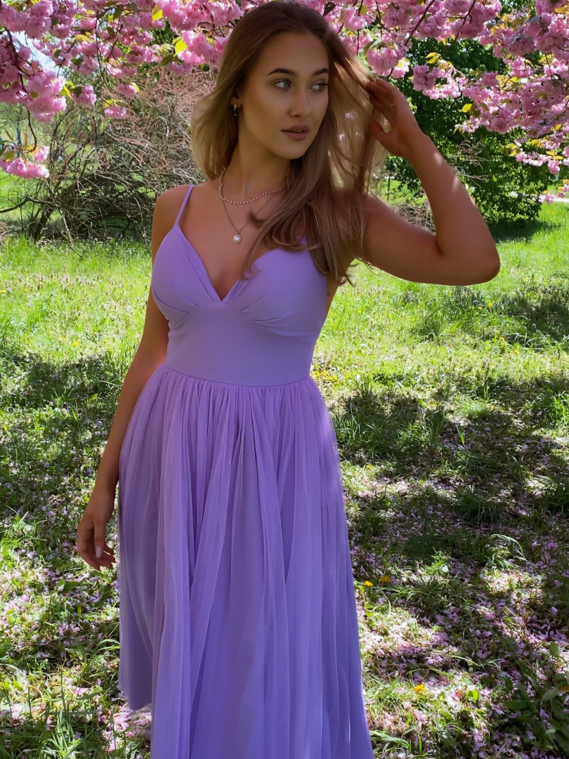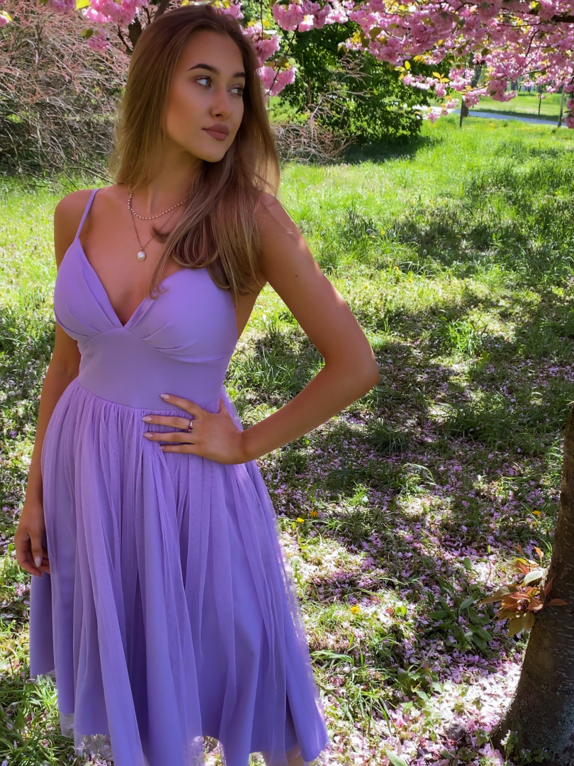 Cindrella wrzosowa - tiulowa suknia midi na szerokim kole w kolorze wrzosowym