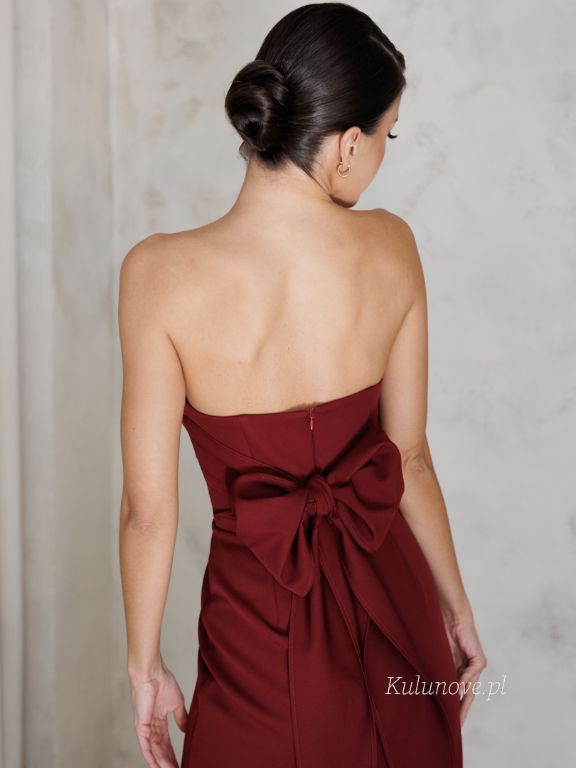 Z tyłu uwagę przyciąga wiązanie z długimi pasami tkaniny, które miękko opływają sylwetkę, tworząc elegancki, kobiecy efekt.