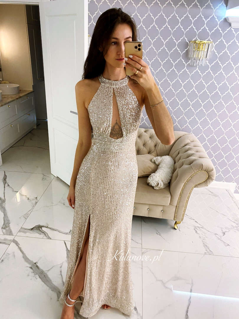 Niesamowita sukienka o długości maxi w całości pokryta błyszczącymi cekinami.