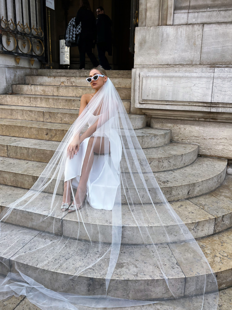 Katedralny welon ślubny zdobiony subtelnymi aplikacjami kwiatowymi Okrycia ślubne