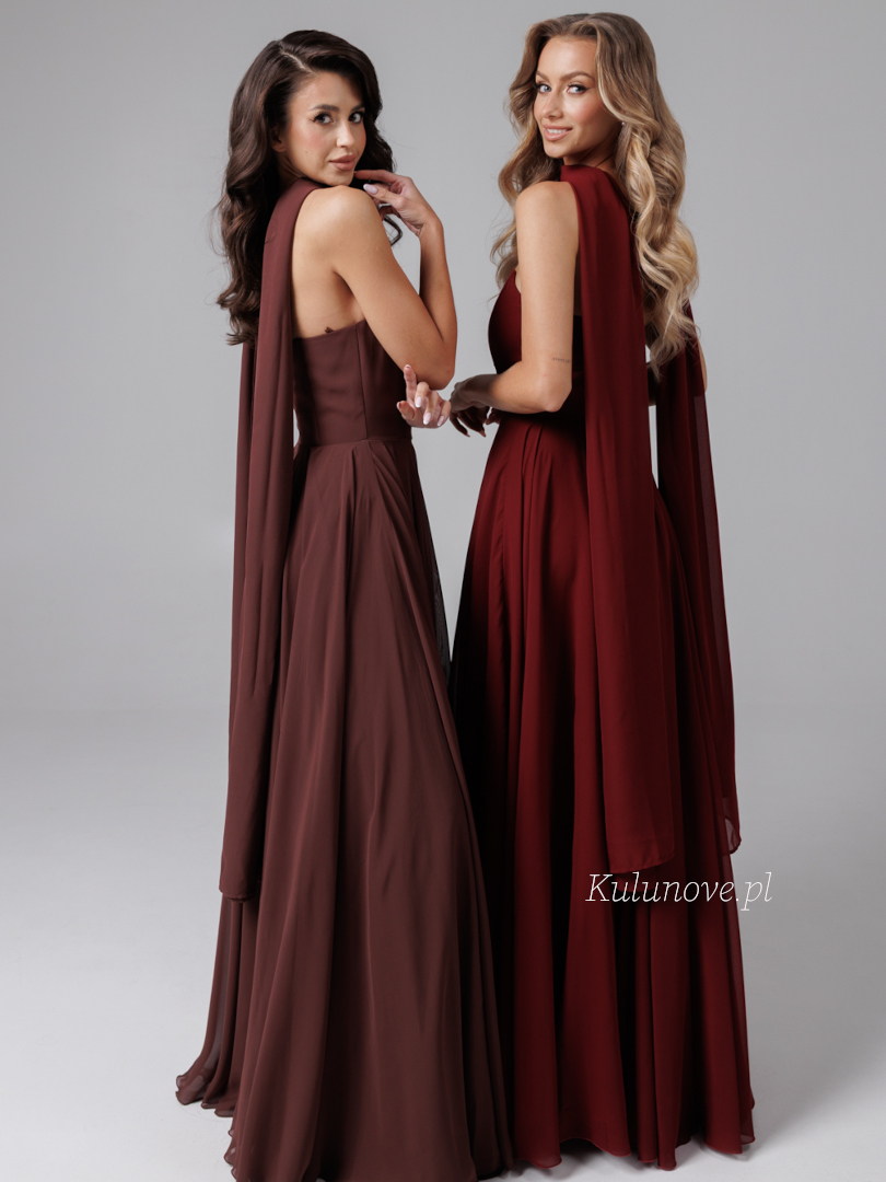 Ella - czekoladowa szyfonowa kreacja z gorsetem pełnym kołem i eleganckim szalem