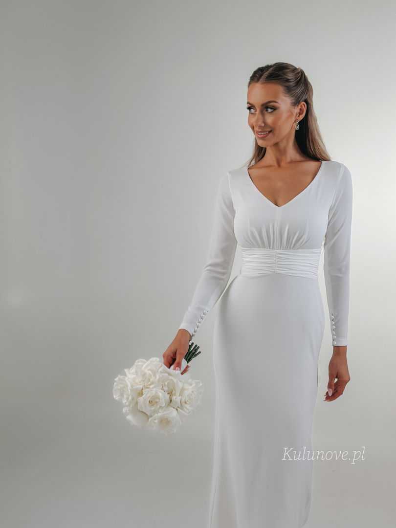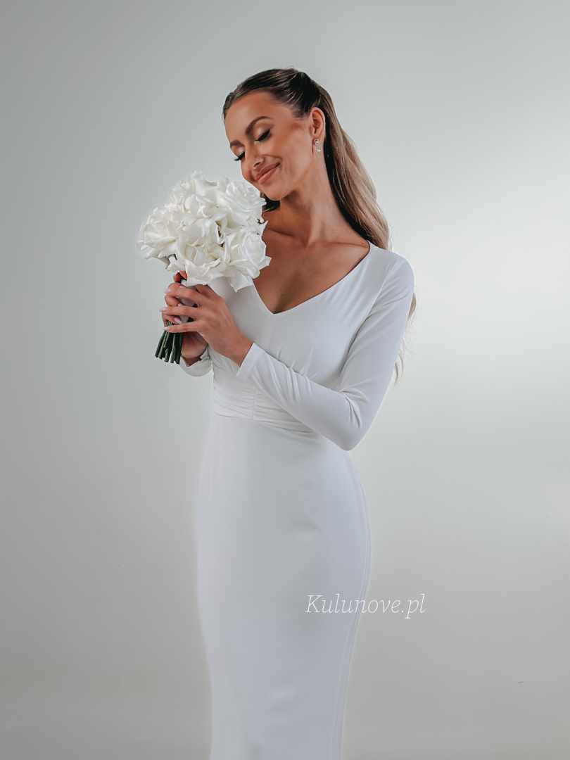 Długa, dopasowana, wykonana z gładkiej tkaniny w kolorze białym. Posiada długie, przylegające rękawy oraz dekolt w kształcie litery „V”, który subtelnie podkreśla linię szyi i dekoltu.