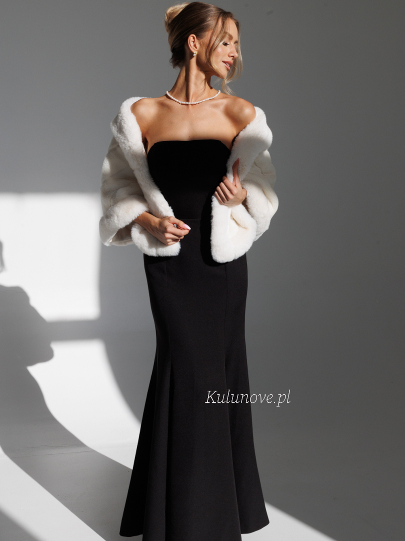 Elegancka, długa sukienka w kolorze głębokiej czerni zachwyca swoją prostotą i klasyką.