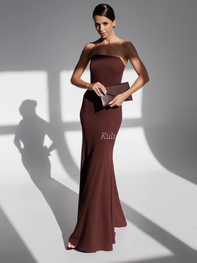 Długa, dopasowana sukienka w ciepłym czekoladowym tonie łączy elegancję z naturalnym wdziękiem.