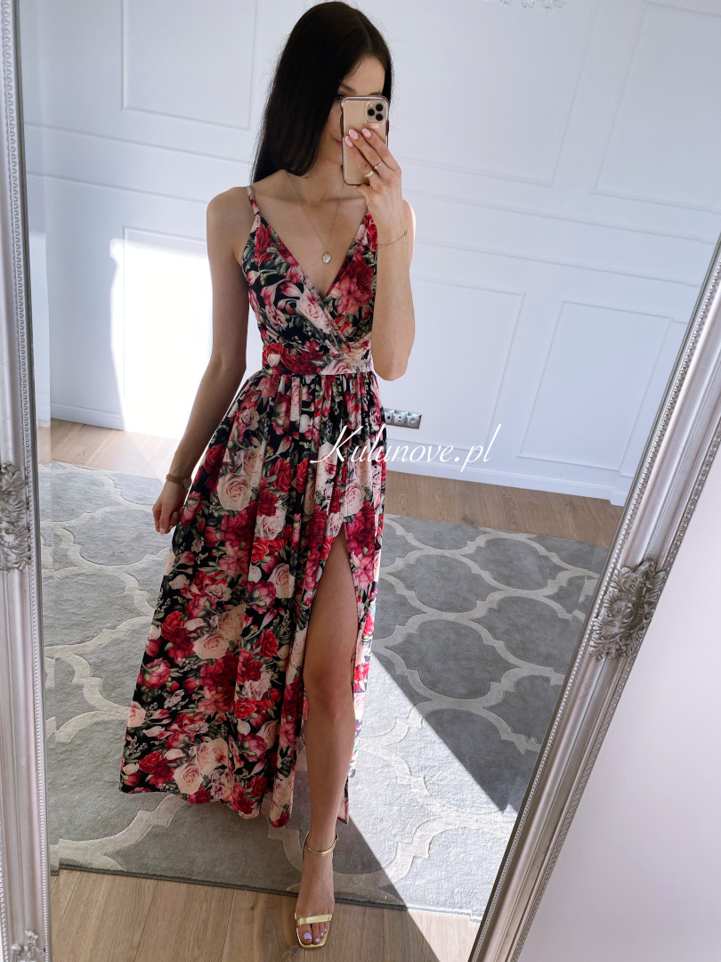Flowers dark - długa sukienka na ramiączkach z dekoltem na zakładkę.