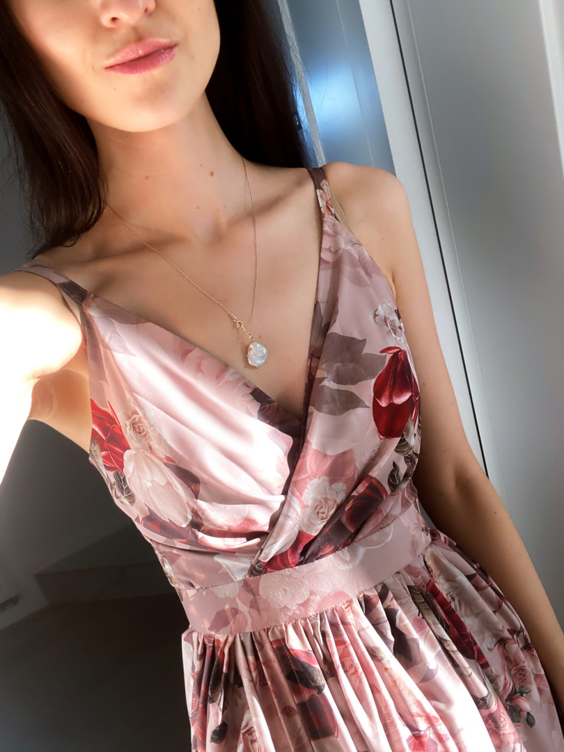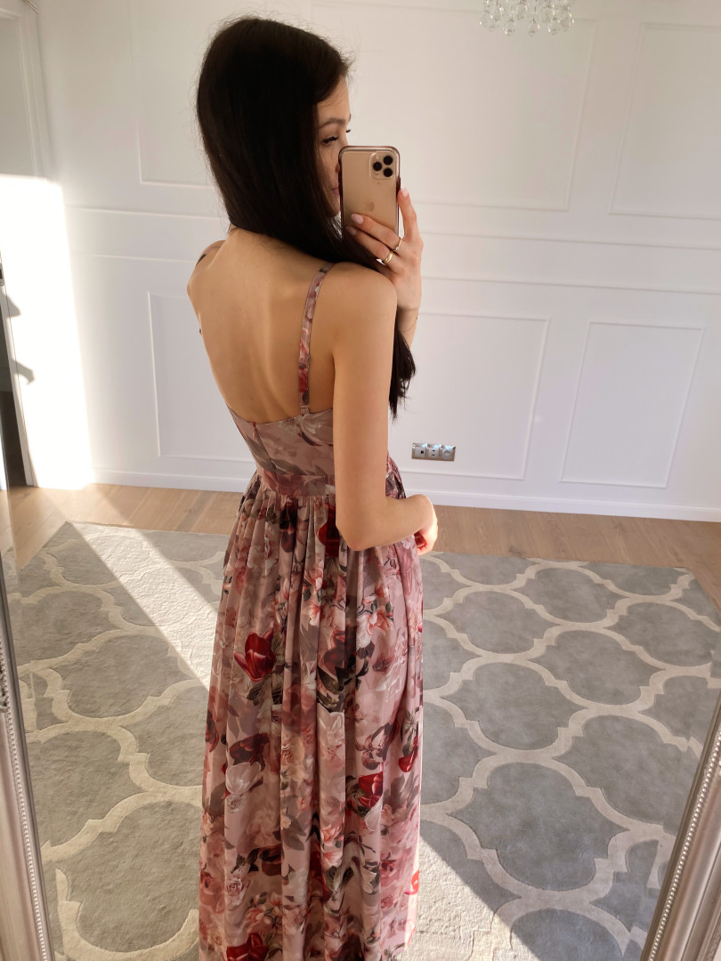 Flowers nude - długa sukienka na ramiączkach z dekoltem na zakładkę
