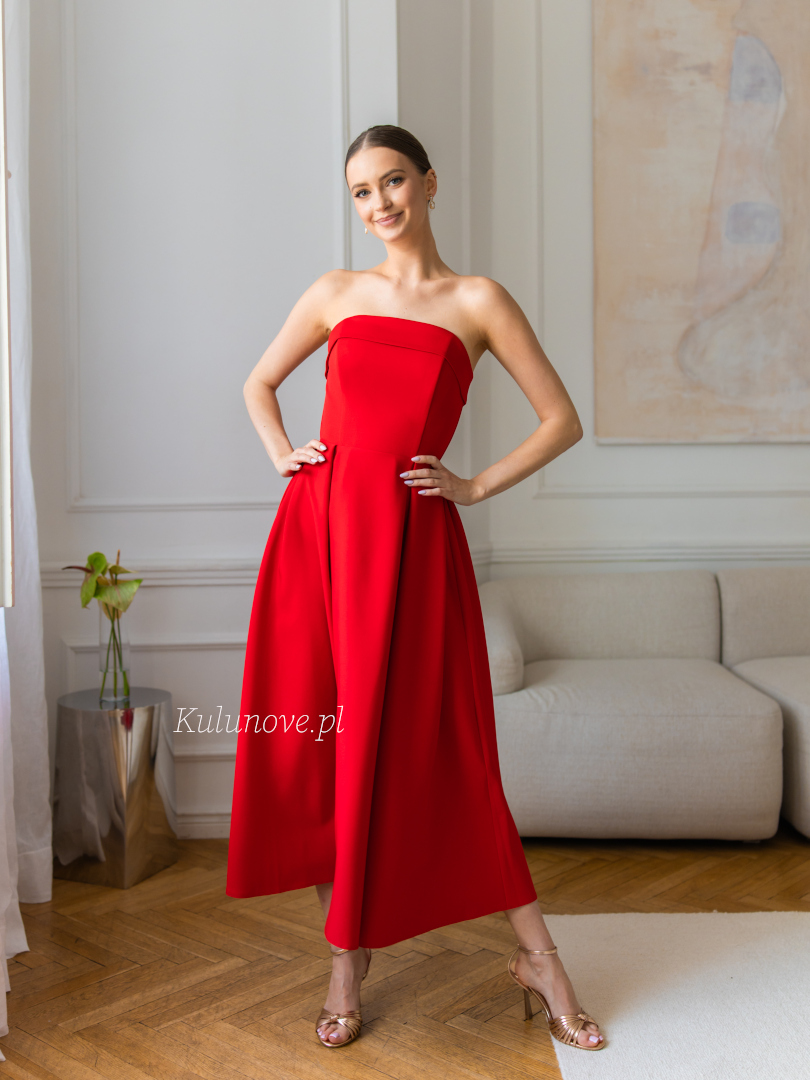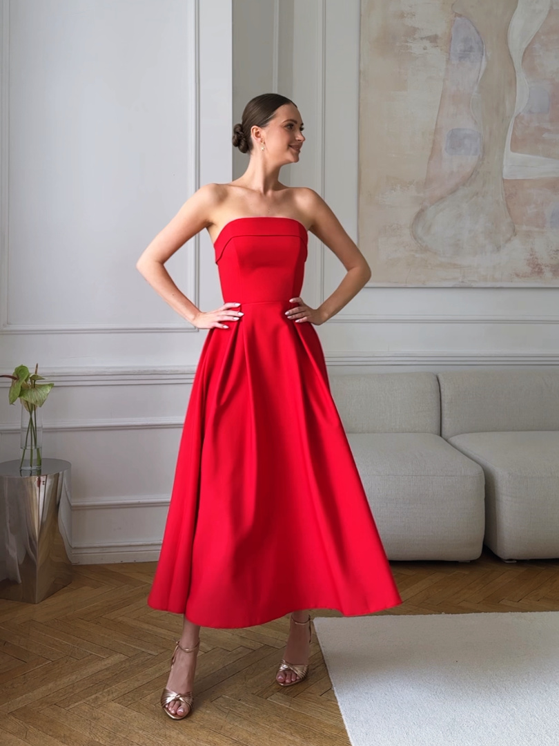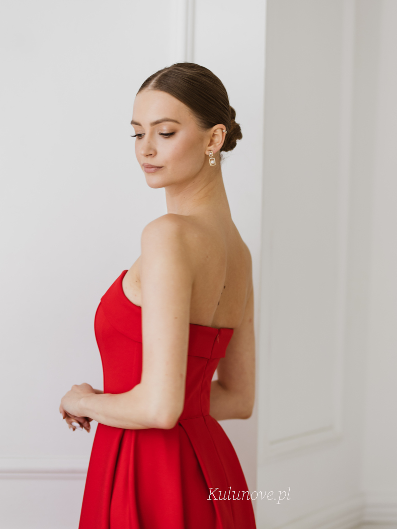 Intensywna czerwień wydobywa nowoczesny charakter sukienki, czyniąc ją niezwykle efektowną.