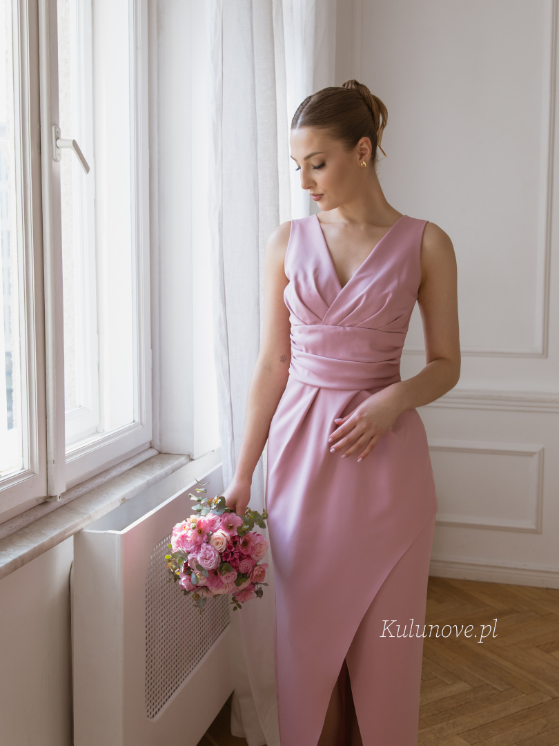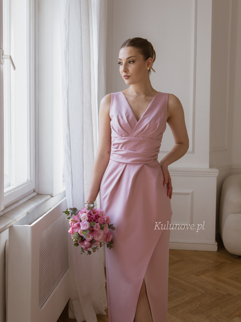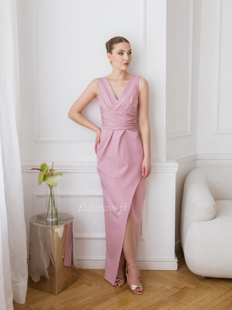 Długość maxi w połączeniu z wysokim rozcięciem z przodu dodaje lekkości i nowoczesnego charakteru, jednocześnie wydłużając optycznie nogi.