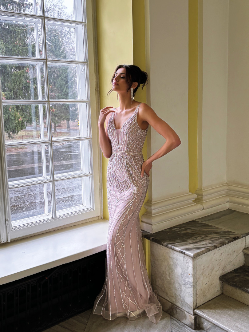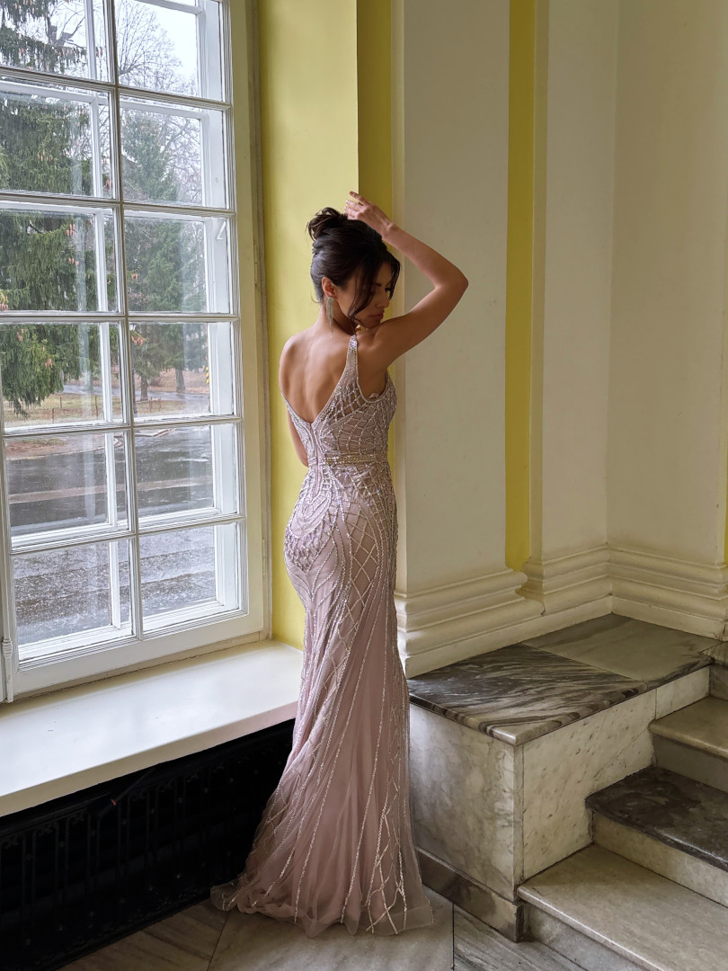 Ingrid - mocno zdobiona sukienka premium w kolorze brudnego różu na ramiączkach i z dekoltem na plecach