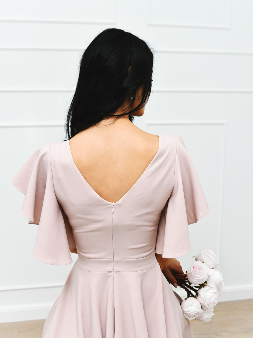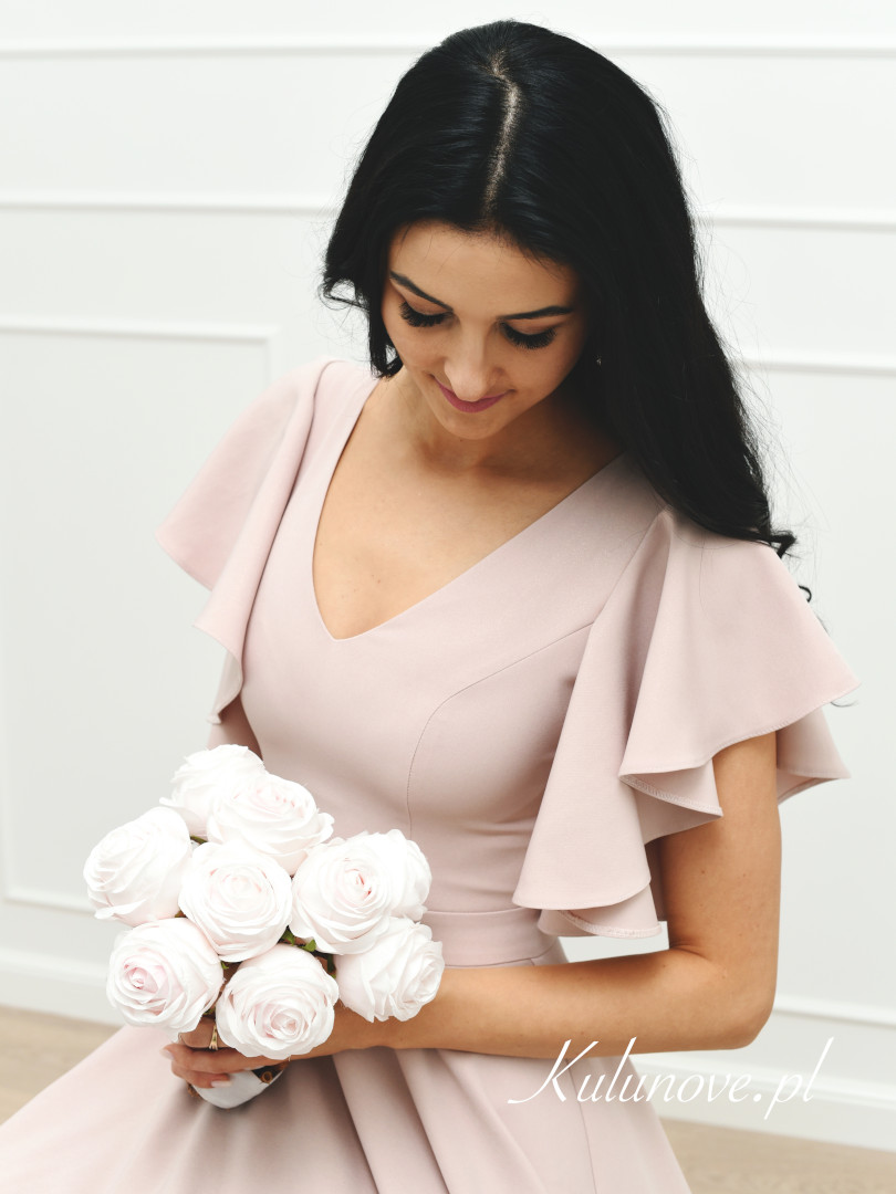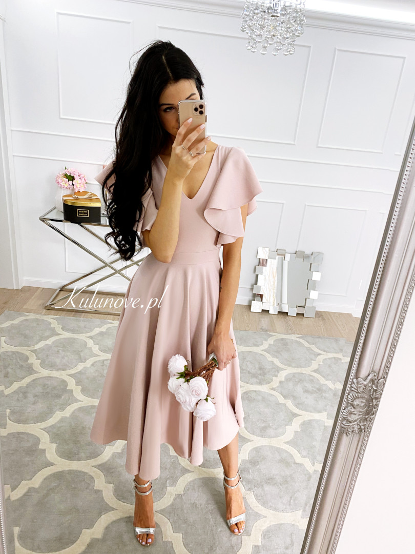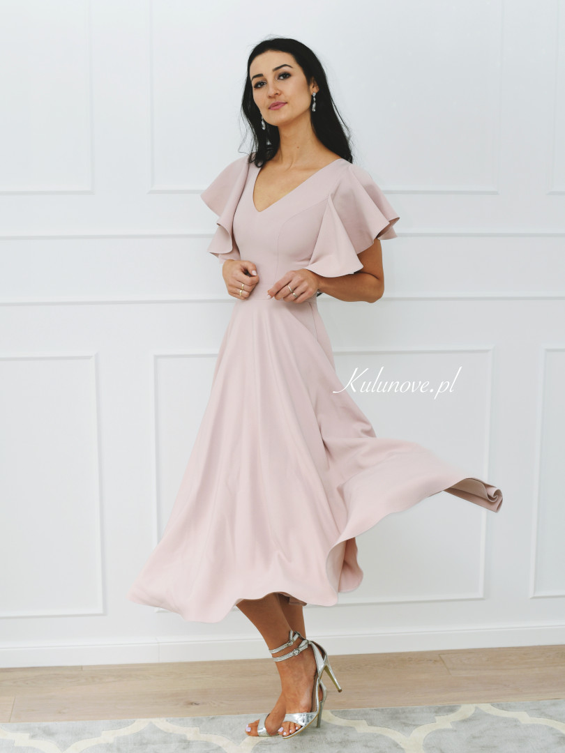 Ponadczasowa sukienka midi w pięknym delikatnym beżowo-różowym kolorze.