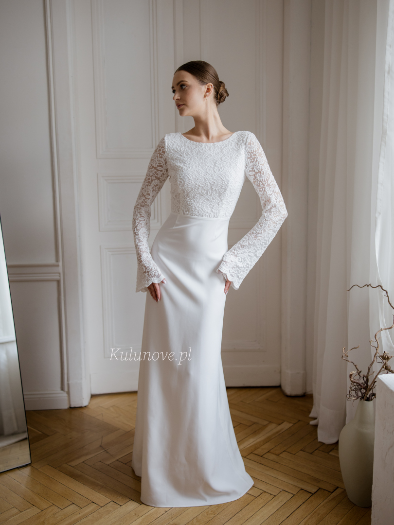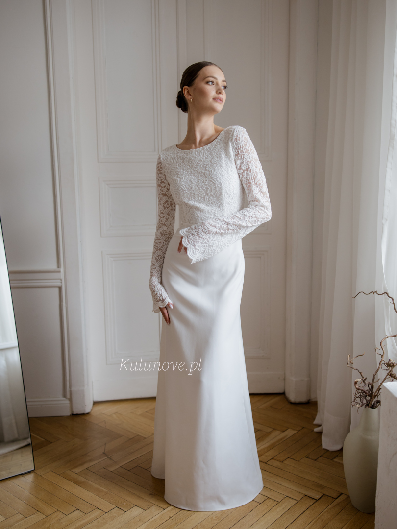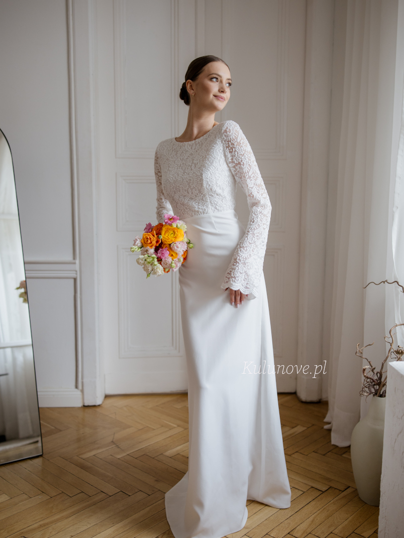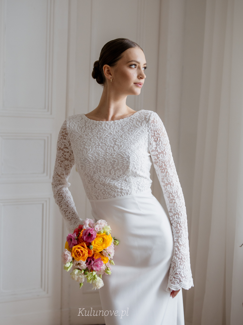Dopasowana góra z delikatnej, elastycznej koronki subtelnie podkreśla sylwetkę, a długie, rozszerzane rękawy dodają całości lekkości i elegancji.