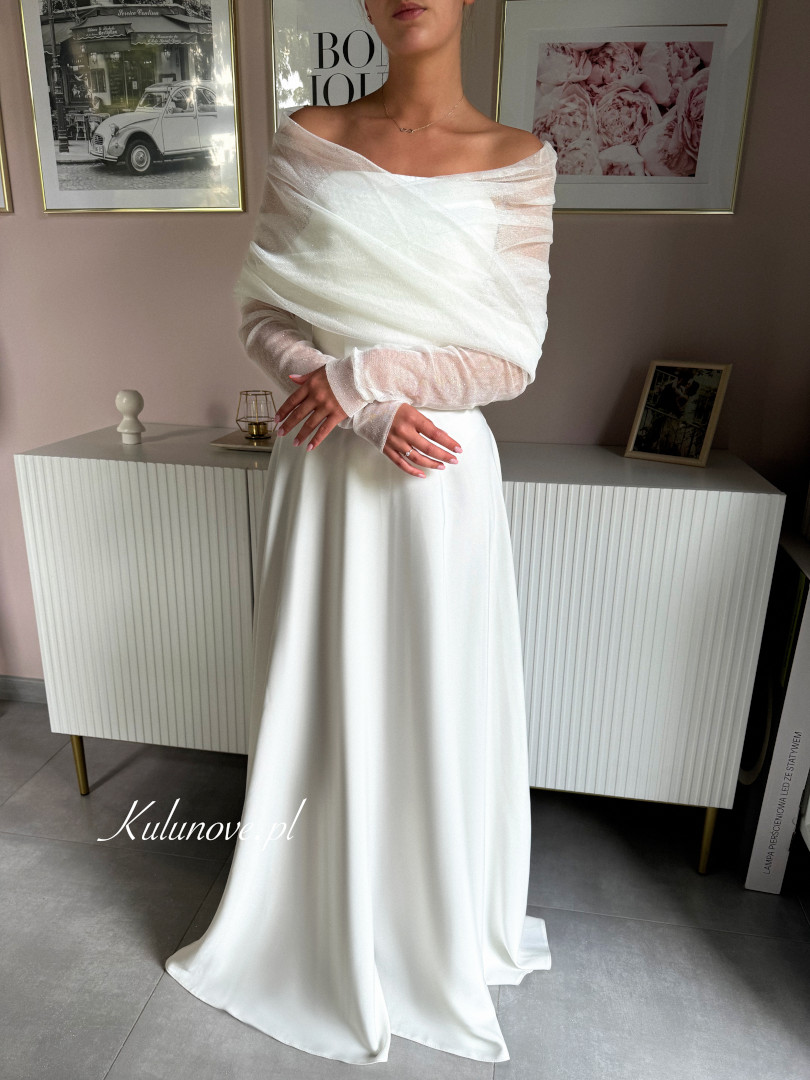 Bolerko wykonane jest z brokatowego tiulu w kolorze ecru.