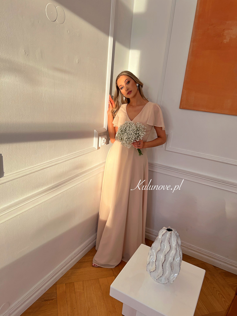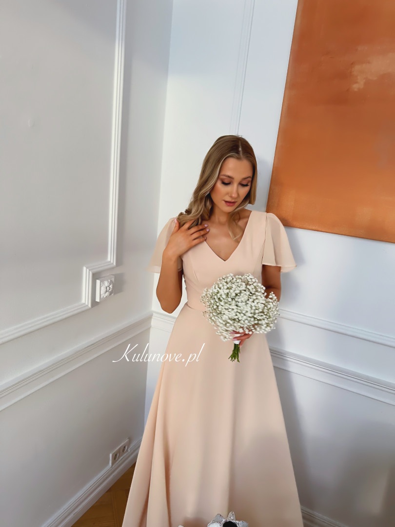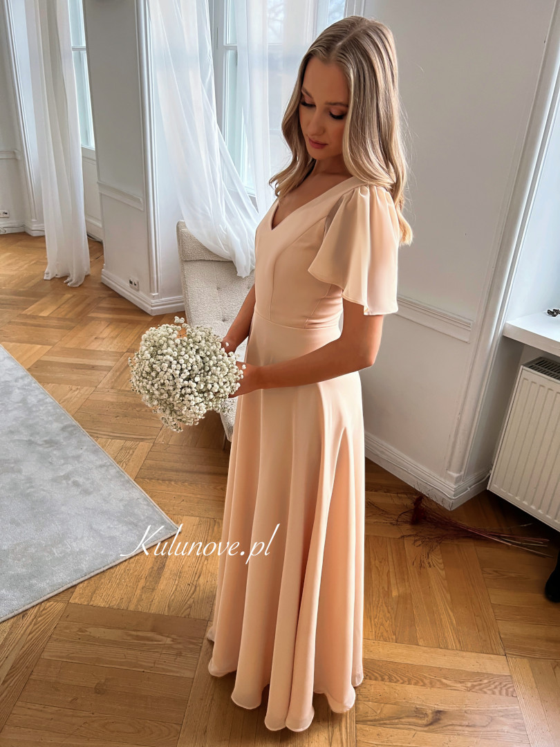 Kylie - szyfonowa długa sukienka z rękawkiem w kolorze ciepłego beżu