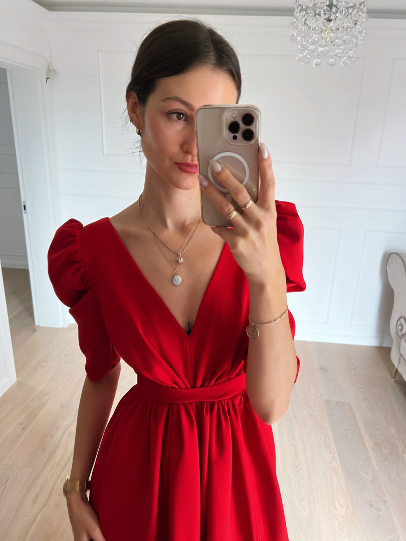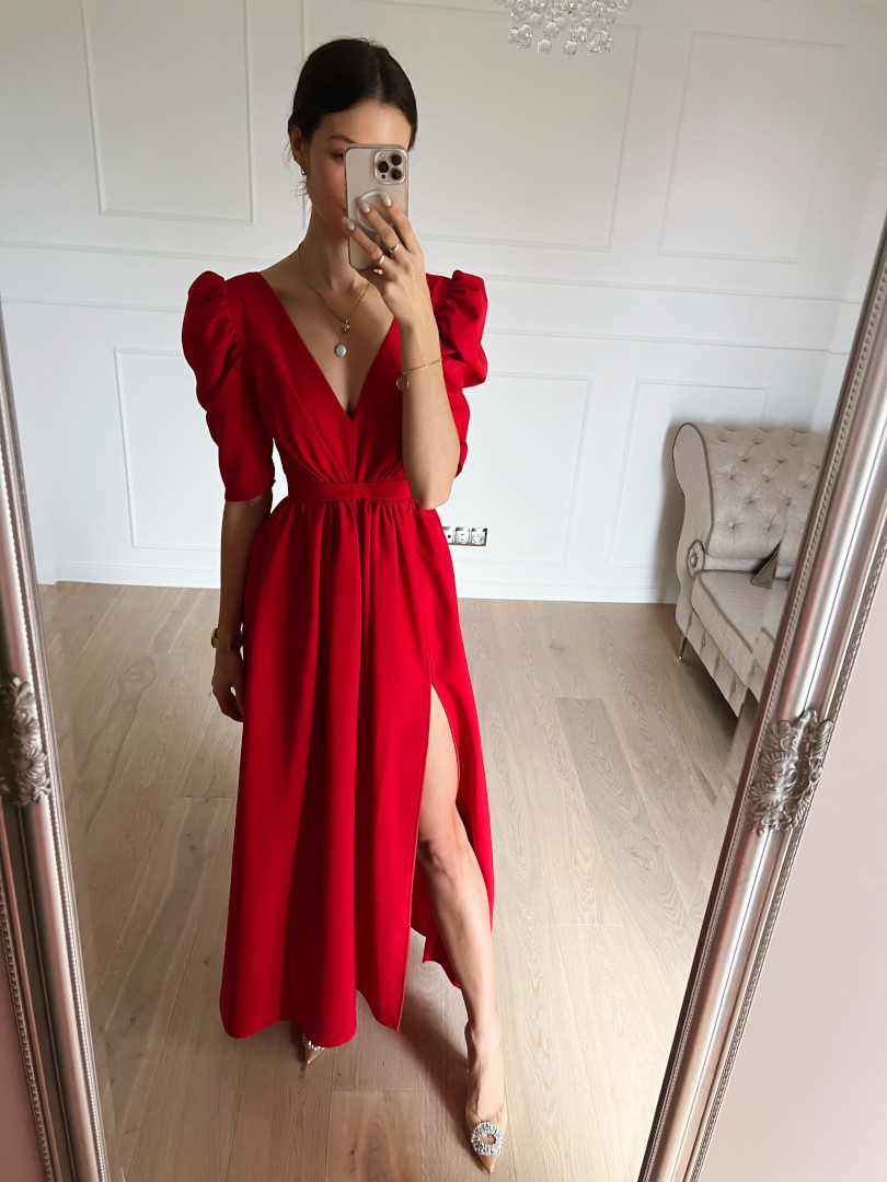 Suknia w kolorze czerwonym z głębokim dekoltem.