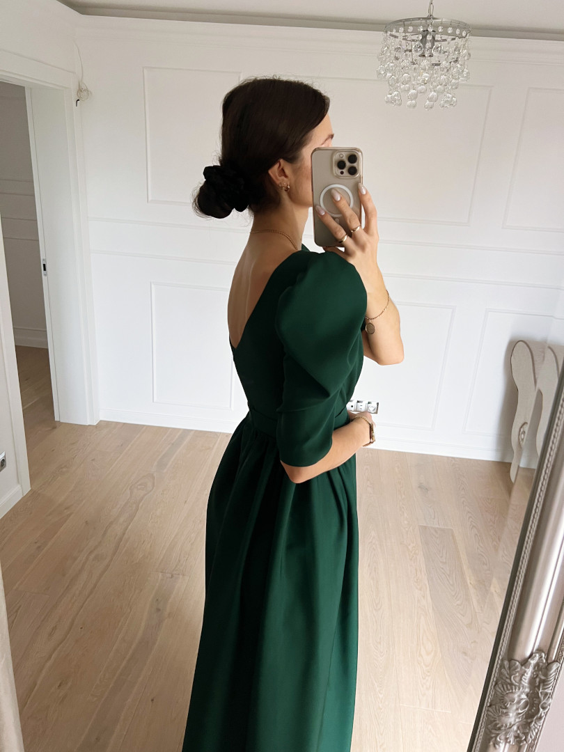 Suknia w kolorze butelkowej zieleni z głębokim dekoltem.