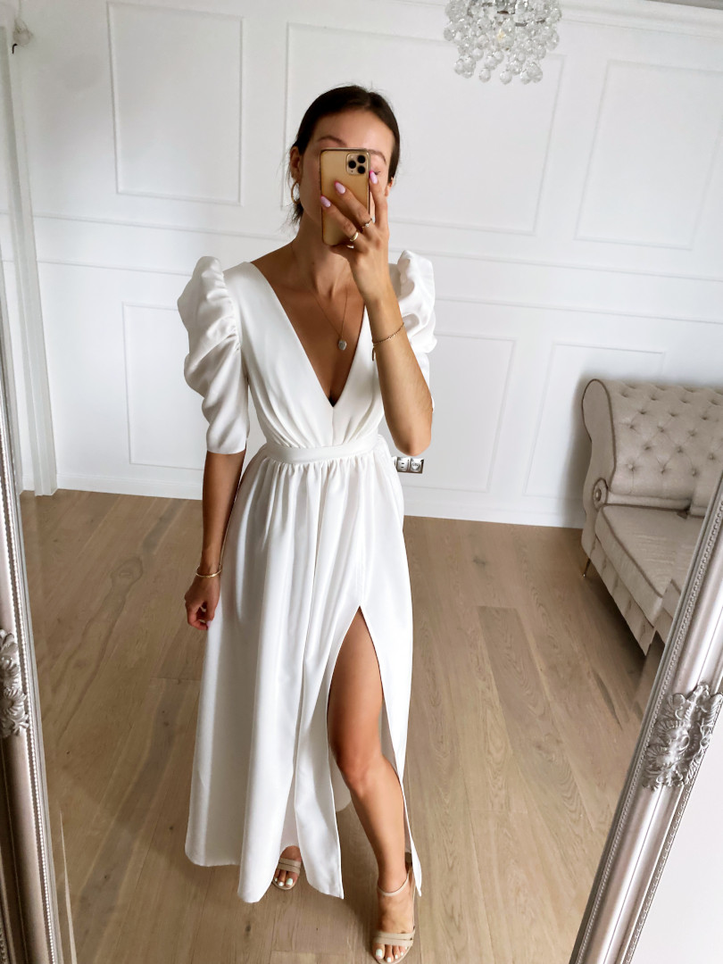 Suknia w kolorze śmietankowym z głębokim dekoltem.