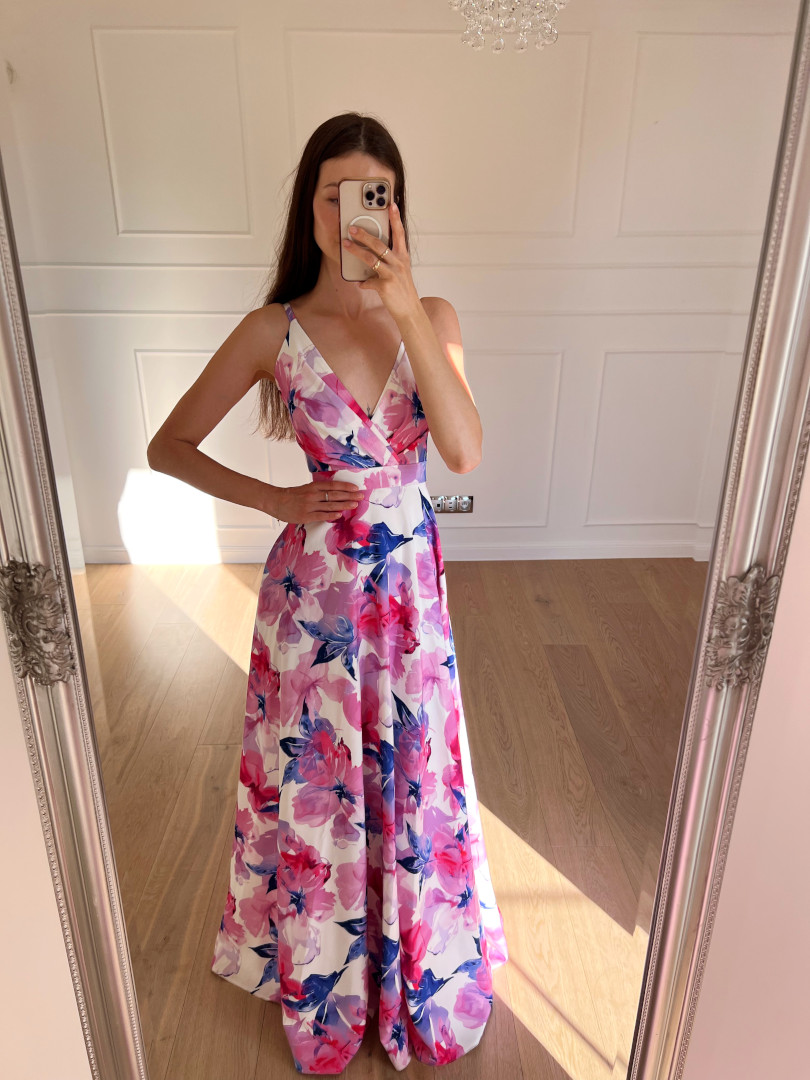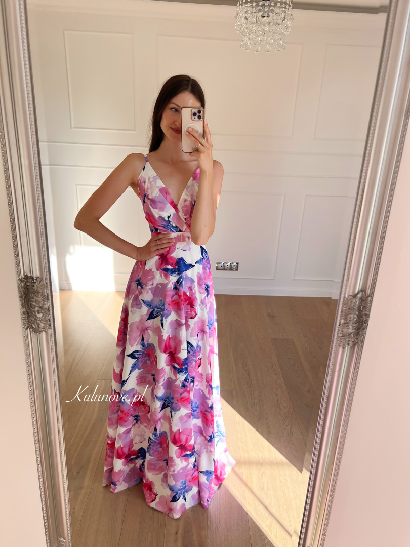 Kwiatowy wzór dodaje delikatności i kobiecości kreacji.