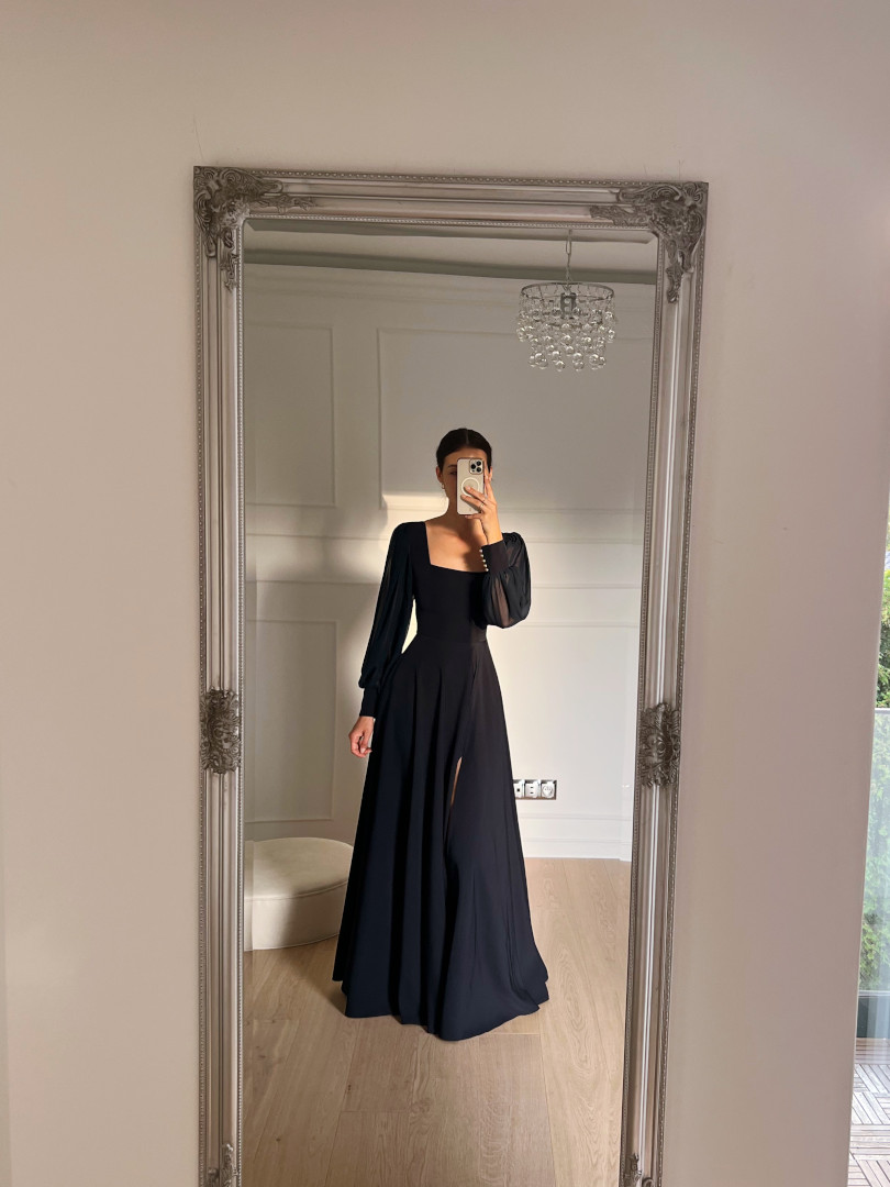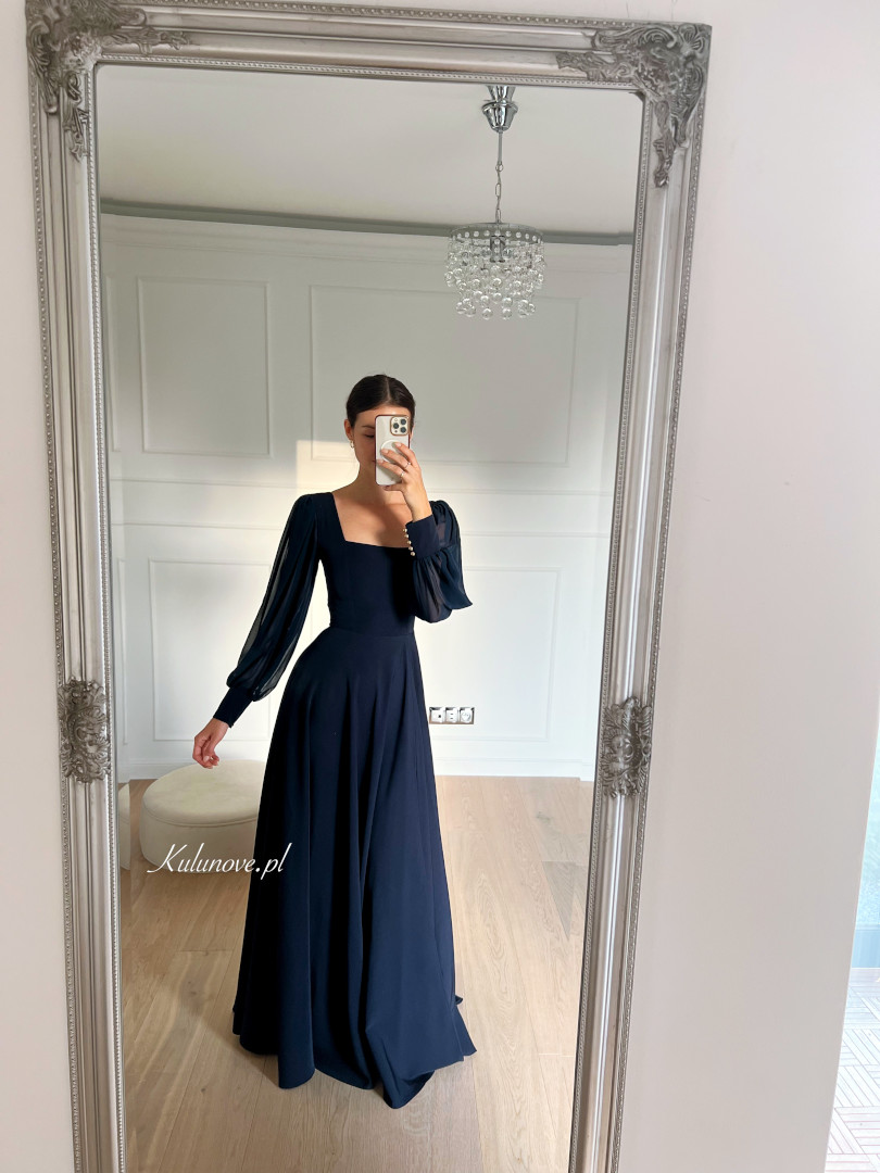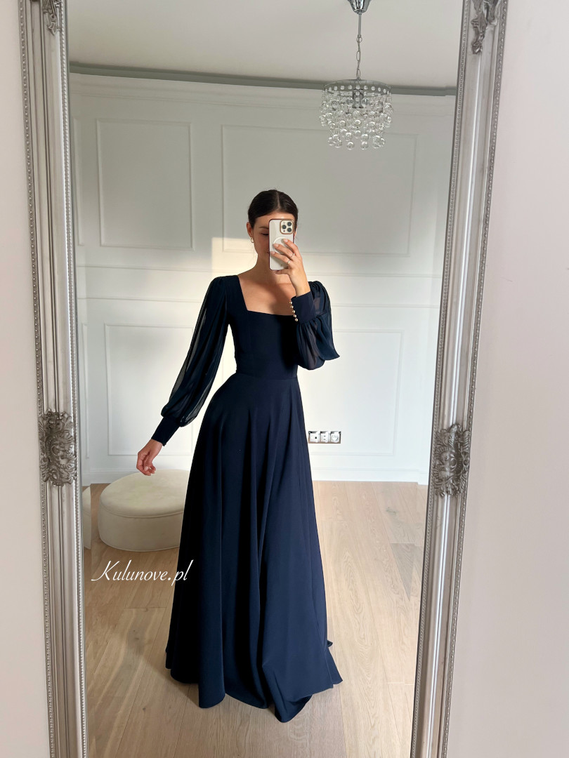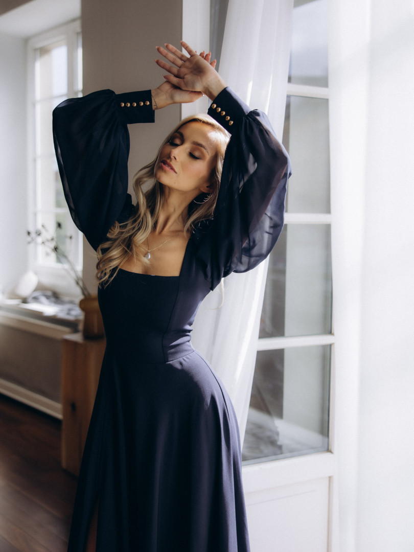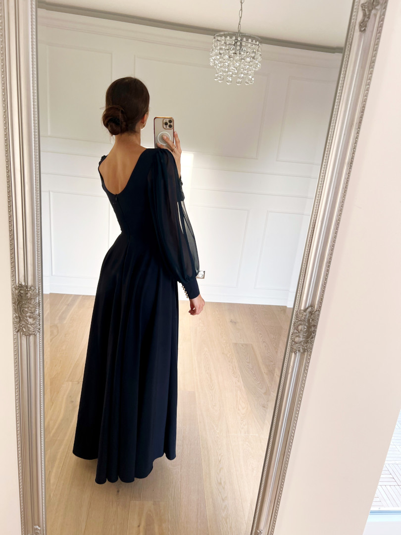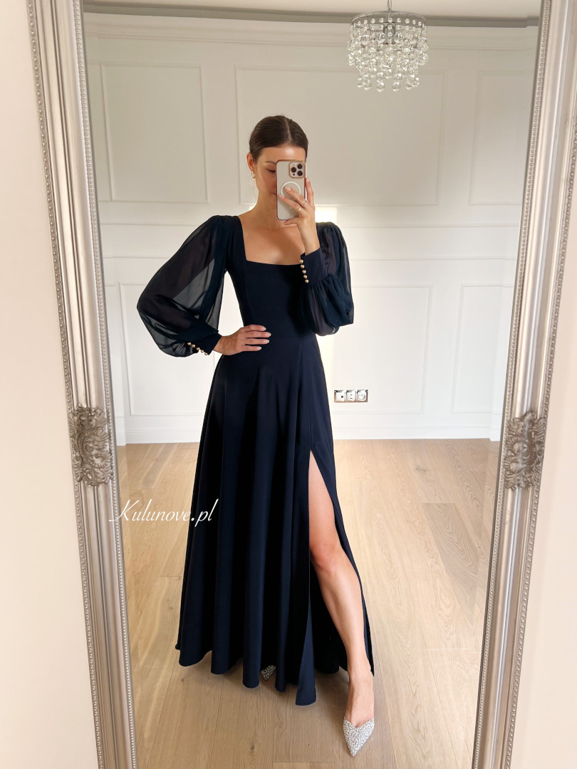 Szyfonowe rękawy zakończone złotymi guzikami.