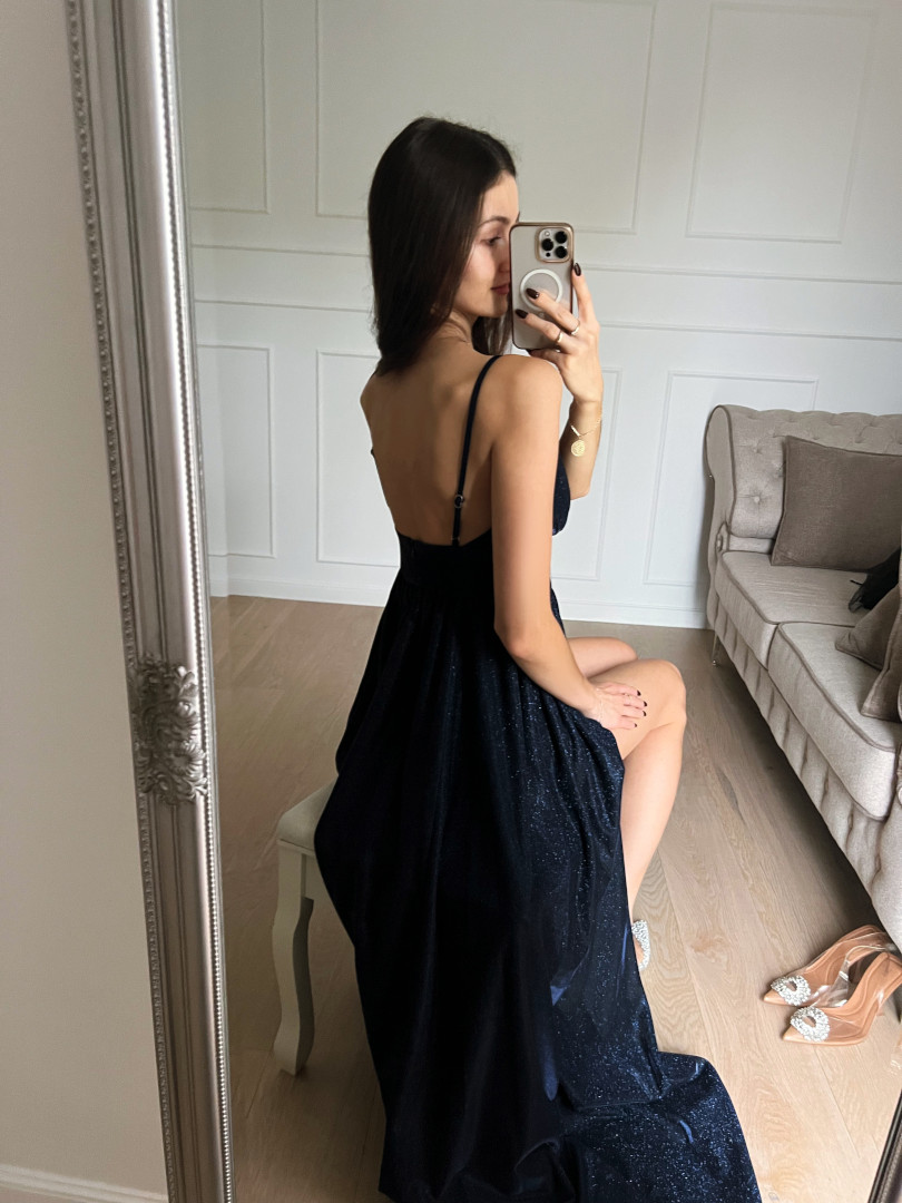 Drobinki brokatu w kolorze ciemnoniebieskim dodają jej szyku i elegancji.