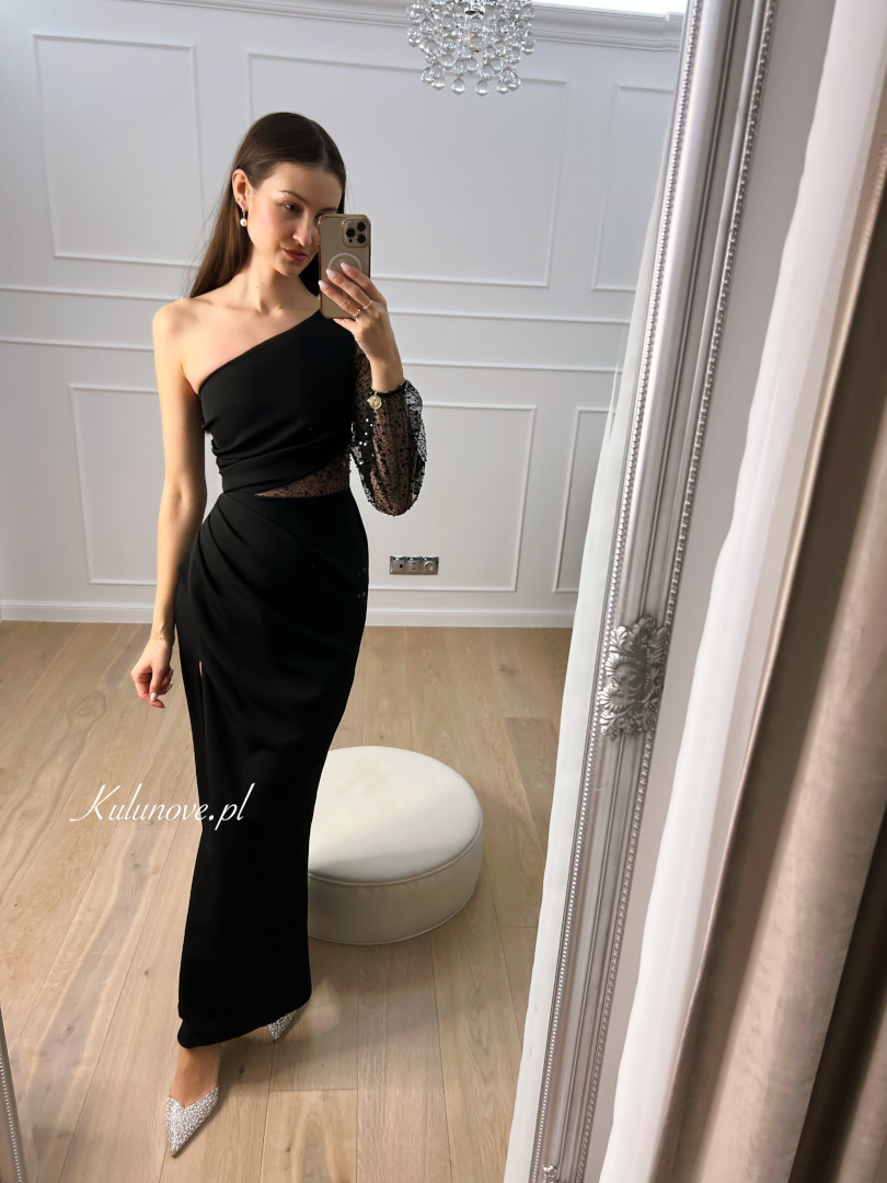 Ma jeden długi rękaw zakończony gumką, w całości także pięknie ozdobiony cekinami.
