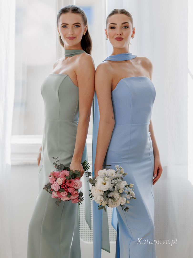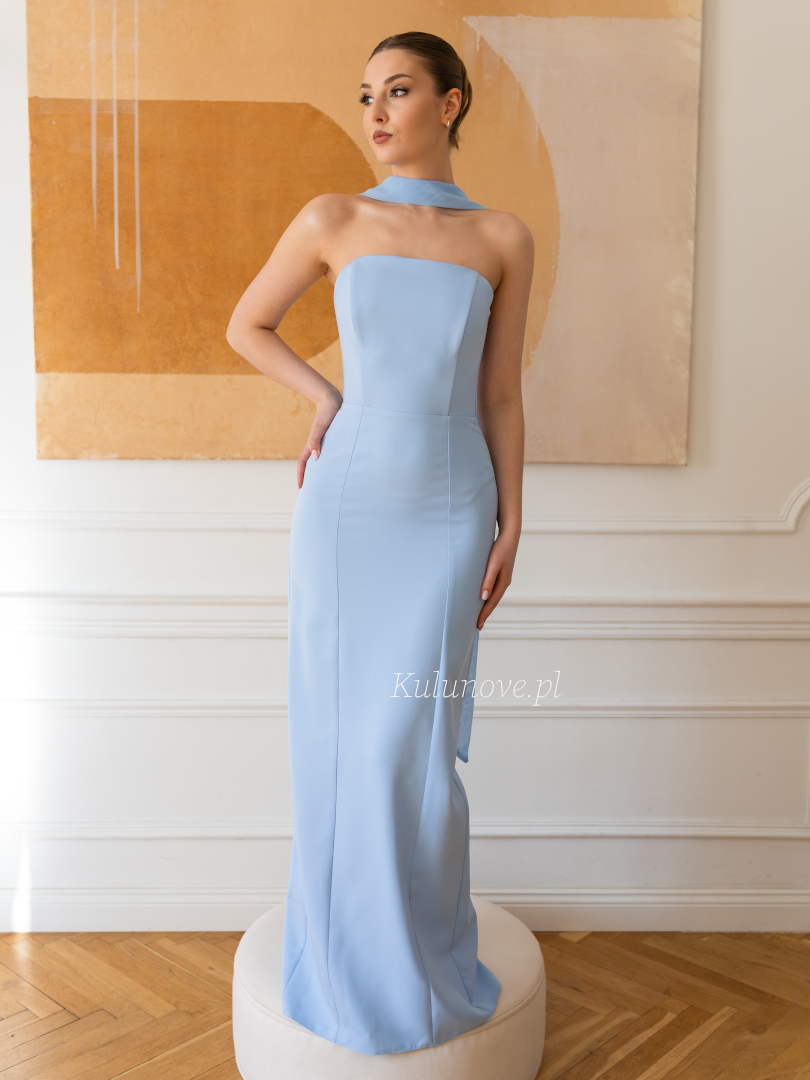 Błękitna wersja tej sukni łączy świeżość koloru z eleganckim fasonem.