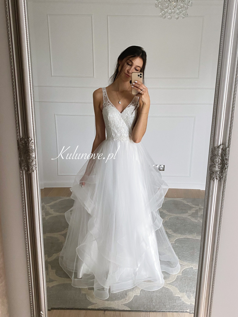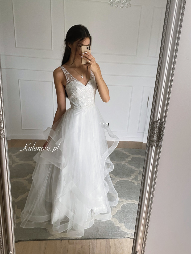 Prosimy o zachowanie szczególnej ostrożności przy zapinaniu sukienki. Sugerujemy, aby przed zapięciem upewnić się, że tiul jest równo ułożony i nie znajduje się zbyt blisko zamka. Dbałość o ten szczegół pomoże uniknąć przypadkowych zniszczeń oraz przedłuży trwałość produktu.